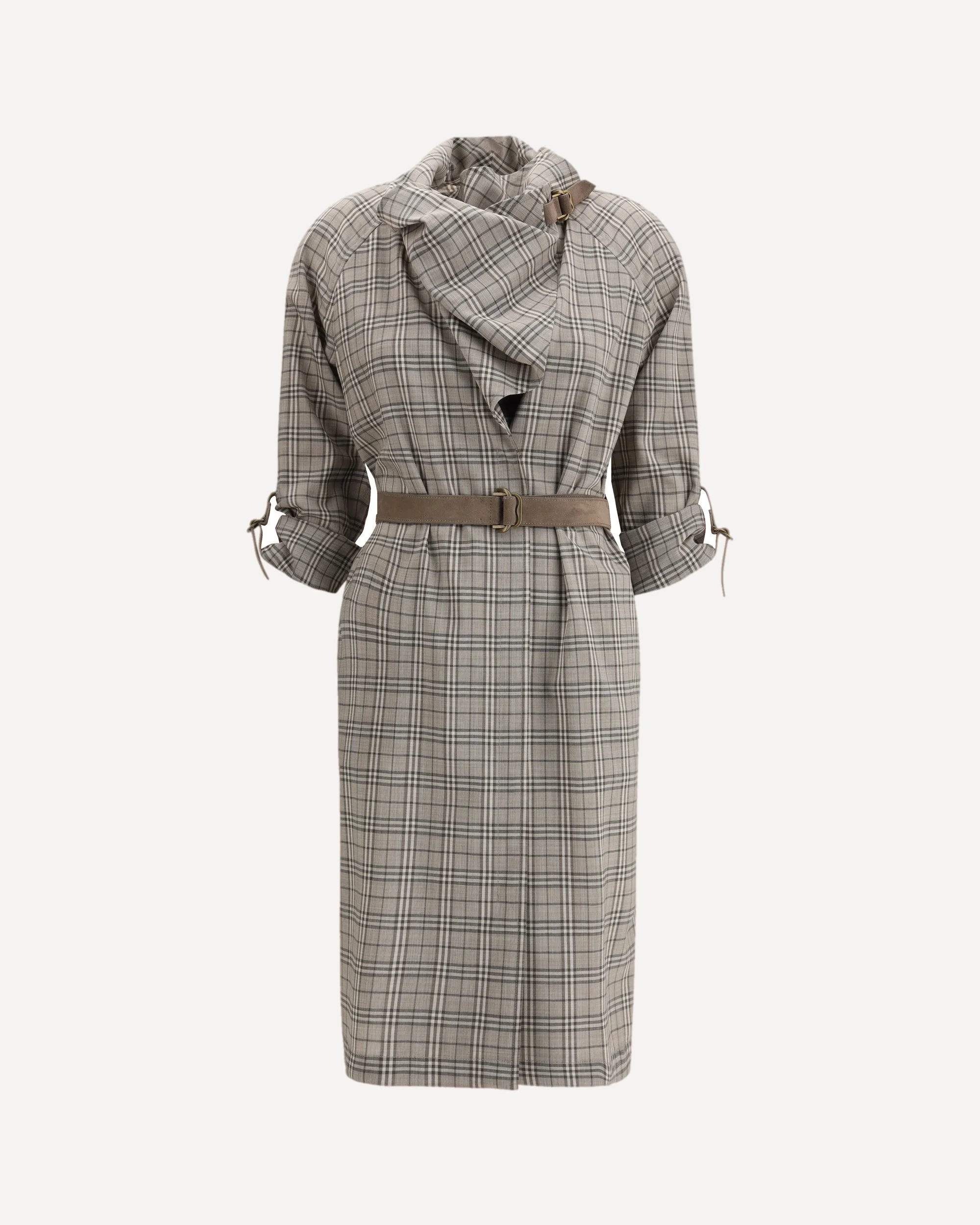 The wool Check Dress with a shawl collar by Burberry features a regular fit and runs true to size; selecting your usual size is recommended. The piece includes a wool belt with a slight stretch, woven in the iconic Burberry Check pattern. The shawl collar can be worn open or closed like a scarf thanks to the detachable suede throat latch, while the matching B-shaped buckle straps allow the sleeve length to be adjusted. The front button fastening completes the design, offering both functional elegance and a distinctive aesthetic. DETAILS - Sku: 8118175_C4507 - Season: SS26 - Fit: Regular - Composition: GENERAL 97% Wool 3% Elastane - MADE IN POLAND