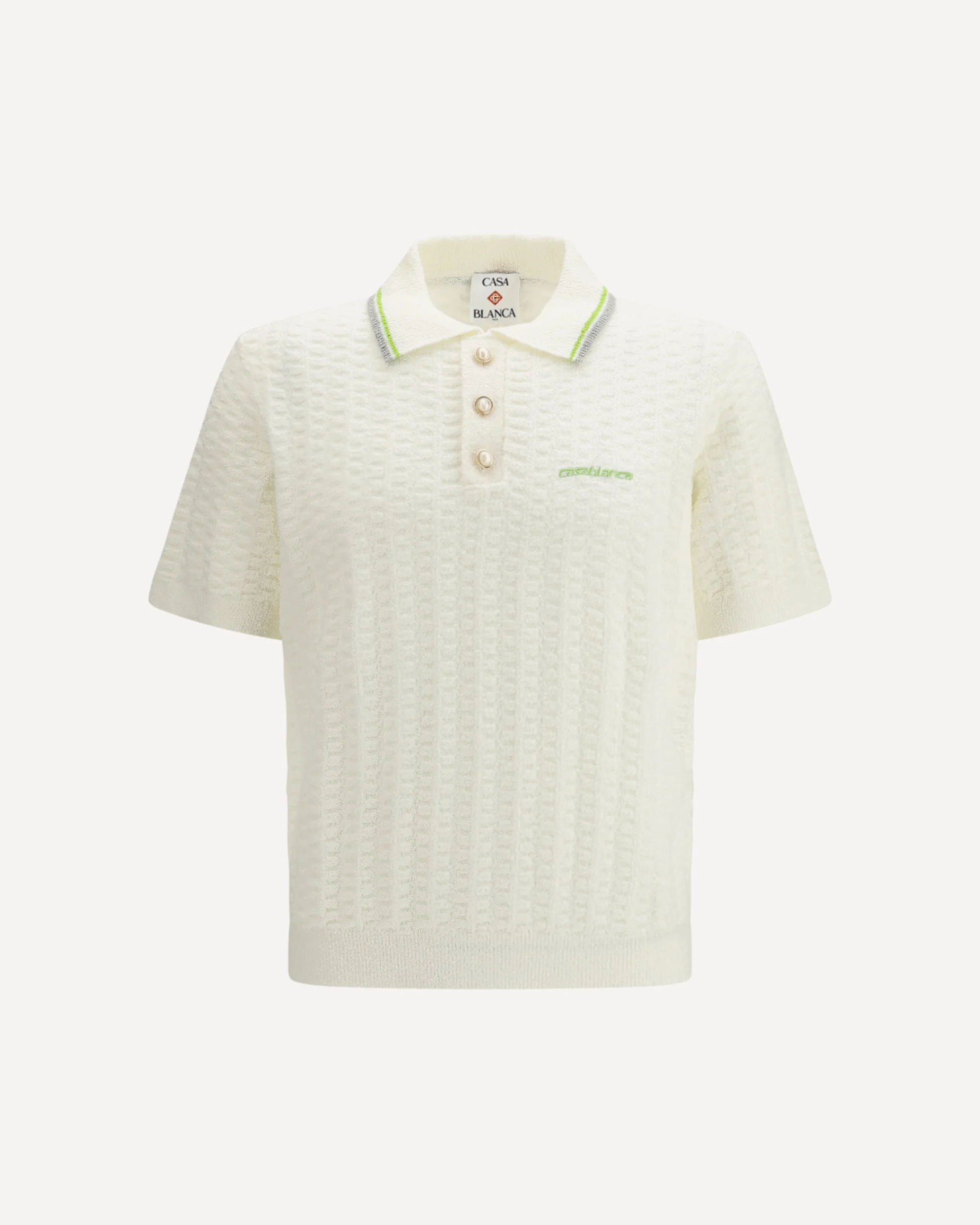 The boucle tennis Polo Shirt by Casablanca is an elegant and sophisticated garment, made from a cotton blend with a distinctive boucle texture. Featuring an embroidered logo on the chest, this polo shirt has a ribbed collar, cuffs, and hem for a perfect fit. The partial closure with jewel buttons adds a touch of refinement, making this model ideal for those looking for a sporty style with a touch of luxury. DETAILS - Sku: MSP26KW121401_WHITE - Season: SS26 - Fit: Regular - Composition: GENERAL 72% Cotton 27% Nylon 1% Elastane - MADE IN CHINA