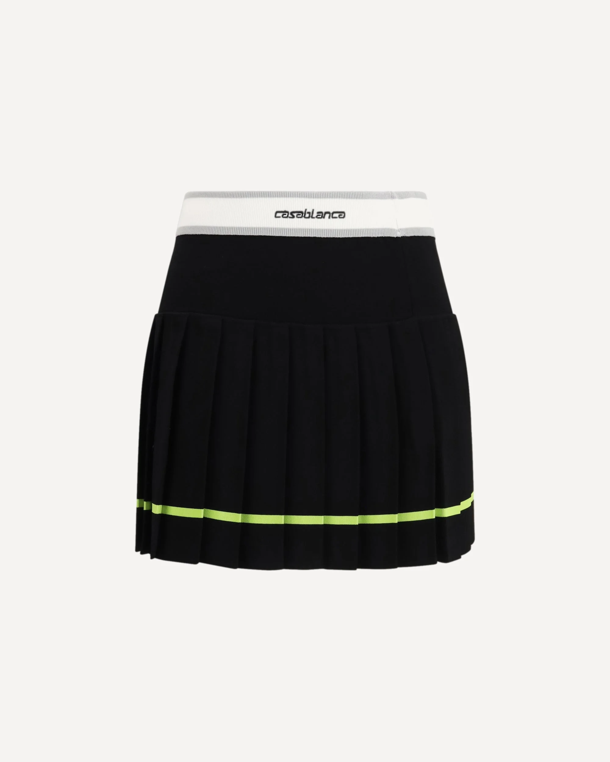 The striped pleated Skirt by Casablanca is a mini skirt with a structured silhouette that reflects the house’s refined, atelier-inspired approach to sportswear. Crafted from viscose fabric, it features an elasticated waistband with the Casablanca logo, a smooth yoke, and a pleated panel finished with a yellow stripe at the hem for a graphic, distinctive touch. DETAILS - Sku: WSP26KW123401_BLACK - Season: SS26 - Fit: Slim - Composition: GENERAL 83% Viscose 17% Polyester - MADE IN CHINA