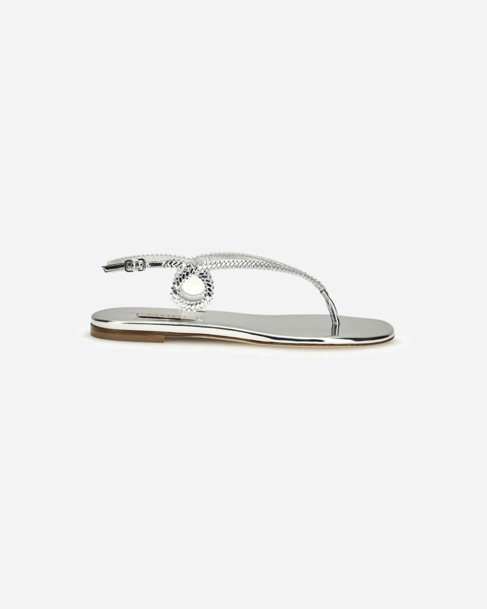 The Josephine Sandals by Casadei reinterpret the flip-flop model with a refined design featuring an adjustable buckle closure. Made of metallic woven leather, they feature a flat sole that ensures comfort and lightness, making them ideal for casual elegance. DETAILS - Sku: 1N251B0101C2952A317_SILVERARGE - Season: SS26 - Composition: GENERAL 100% Calf Leather Bos Taurus - MADE IN ITALY
