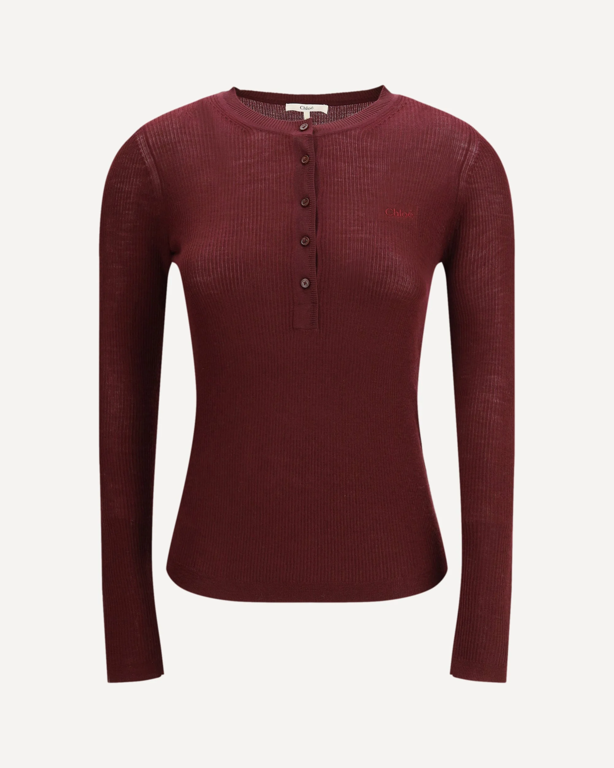 The Hanley ribbed long-sleeve T-shirt by Chloe is crafted from soft stretch fabric featuring an all-over ribbed texture that flatters the figure. It showcases a front placket with button fastening, a crew neckline, and the signature Triomphe motif, embodying the brand’s refined and timeless elegance. DETAILS - Sku: CH24WMP51667_601 - Season: SS26 - Fit: Slim - Composition: GENERAL 100% Wool - MADE IN ITALY
