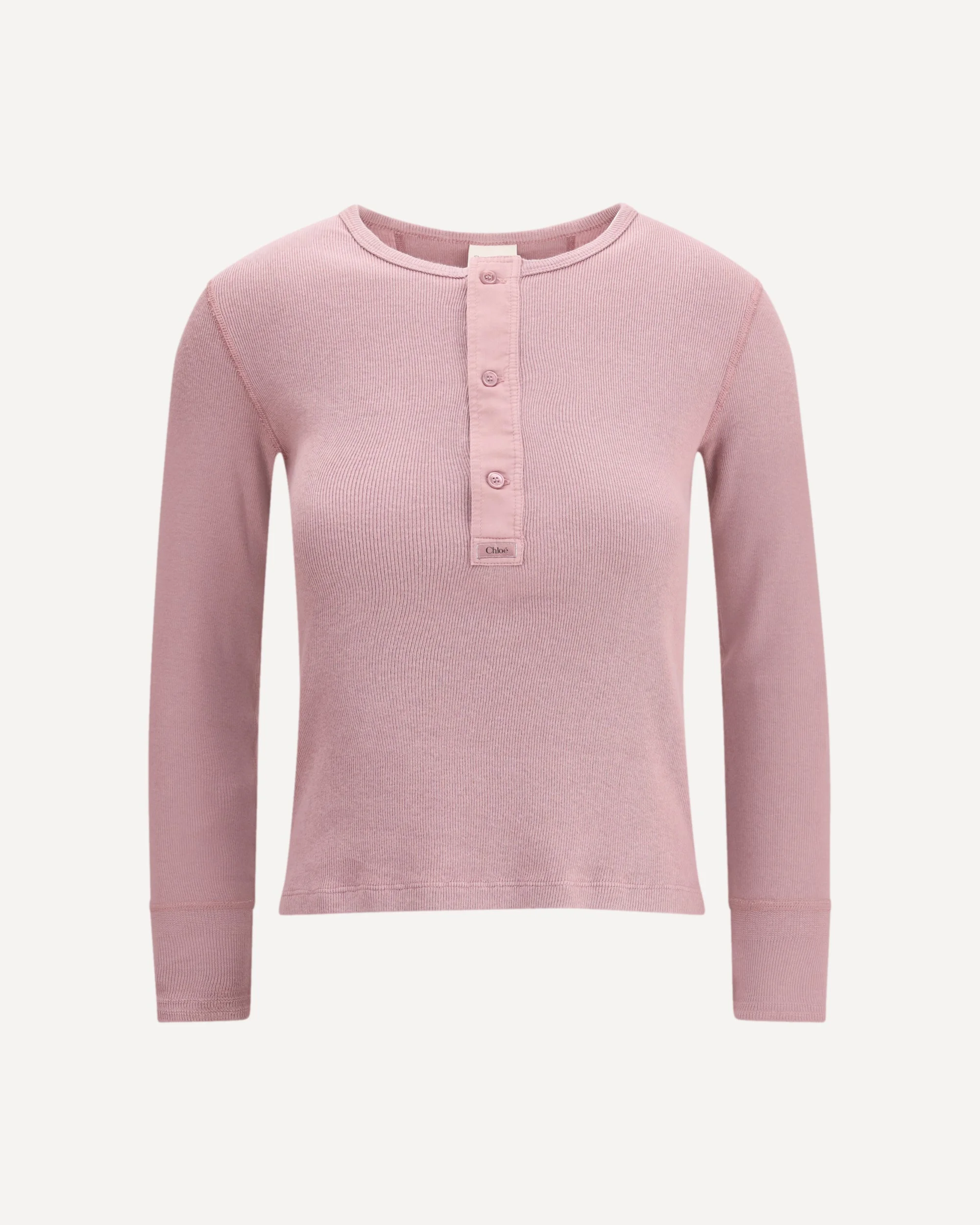 The Henley Shirt by Chloe is crafted from ribbed organic cotton jersey, a soft and flexible fabric that provides a fitted, streamlined silhouette. Flatlock seams enhance the construction with a clean finish, while mother-of-pearl buttons introduce a subtle, refined touch. The tonal Chloe logo is embroidered at the back of the neck, paired with a logo tab placed at the base of the placket. A versatile, polished piece designed to elevate everyday dressing with understated elegance. DETAILS - Sku: CH26SJH30185_50C - Season: SS26 - Fit: Slim - Composition: GENERAL 100% Cotton - MADE IN PORTUGAL