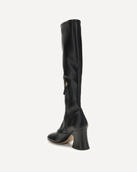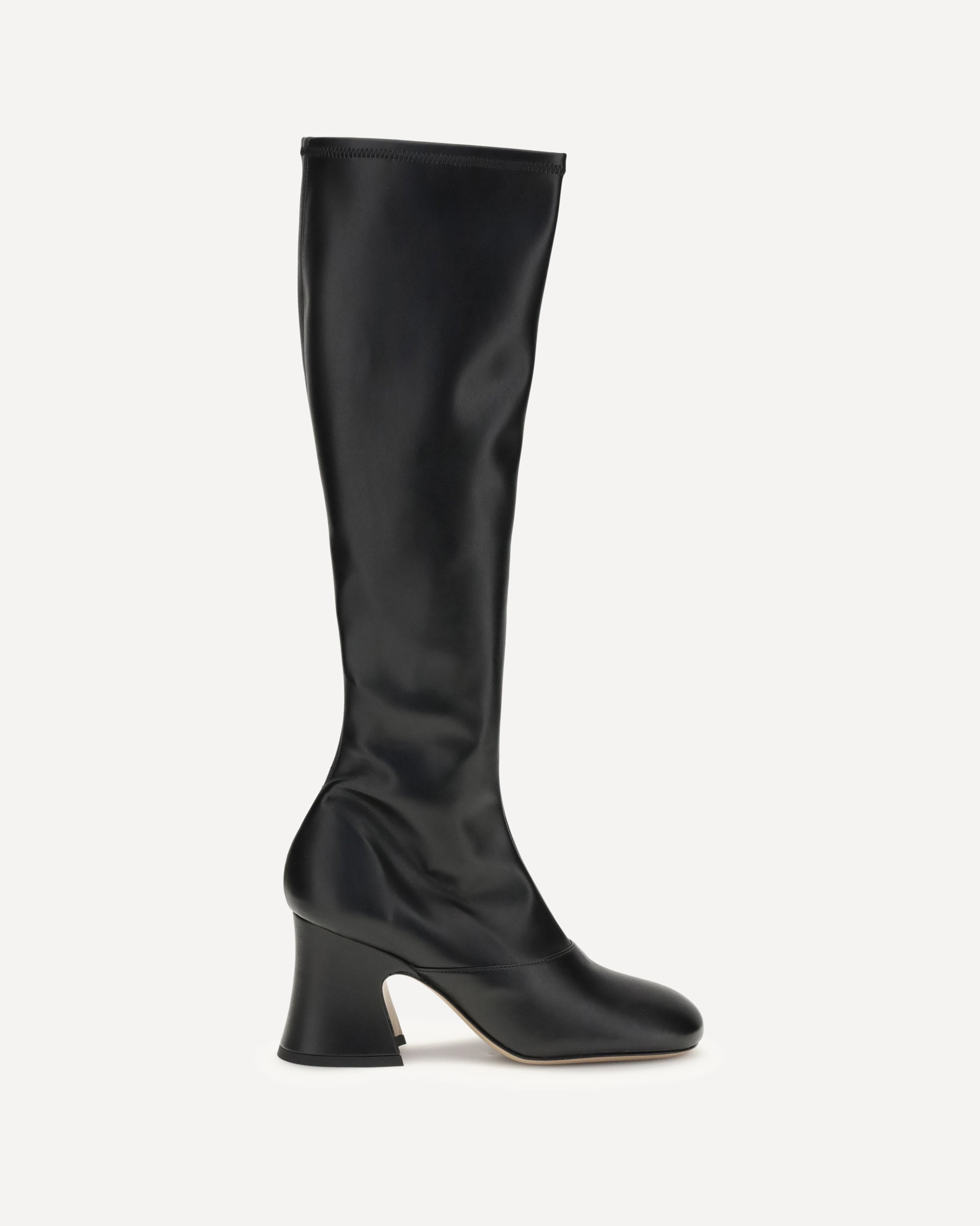 The Janis heeled boots by Chloe are crafted from soft stretch fabric with a leather-effect finish, providing a second-skin fit. Featuring a stacked bell heel, they combine a high tubular design with a slightly squared toe for a modern and elegant look. DETAILS - Sku: CH25W13HUH_001 - Season: AW25 - MADE IN ITALY