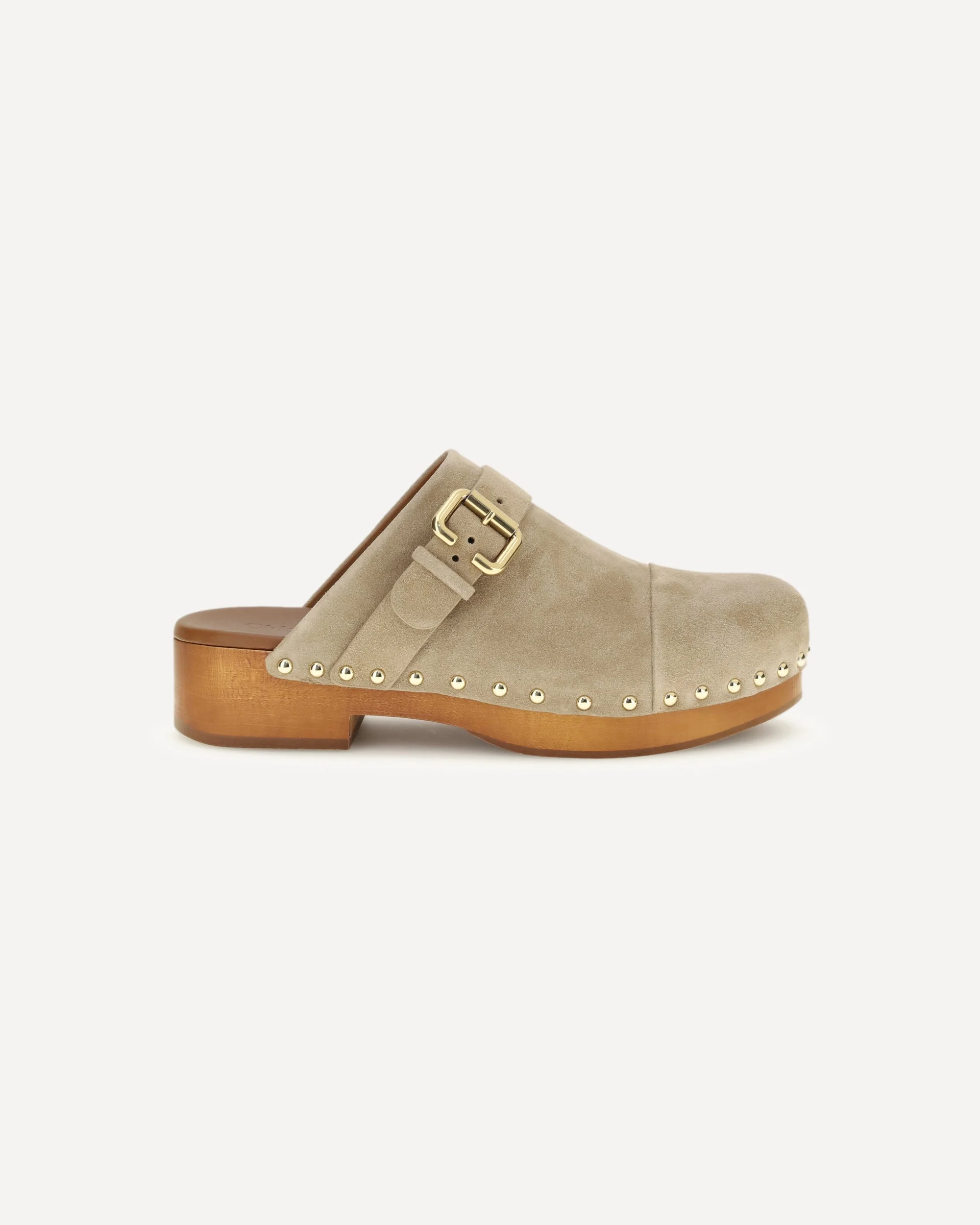 Le Jeannette Clog Mules by Chloe reinterpret an iconic shape from the Maison, combining a suede calfskin upper with a low wooden platform wedge that ensures a comfortable, natural fit. Gold studs and the iconic Paddington buckle complete the design, adding a distinctive and refined touch to these flat clogs with timeless appeal. DETAILS - Sku: CH26S12ZRY_751 - Season: SS26 - Composition: UPPER 100% Calf Leather Bos Taurus SOLE 100% Others Materials - MADE IN ITALY