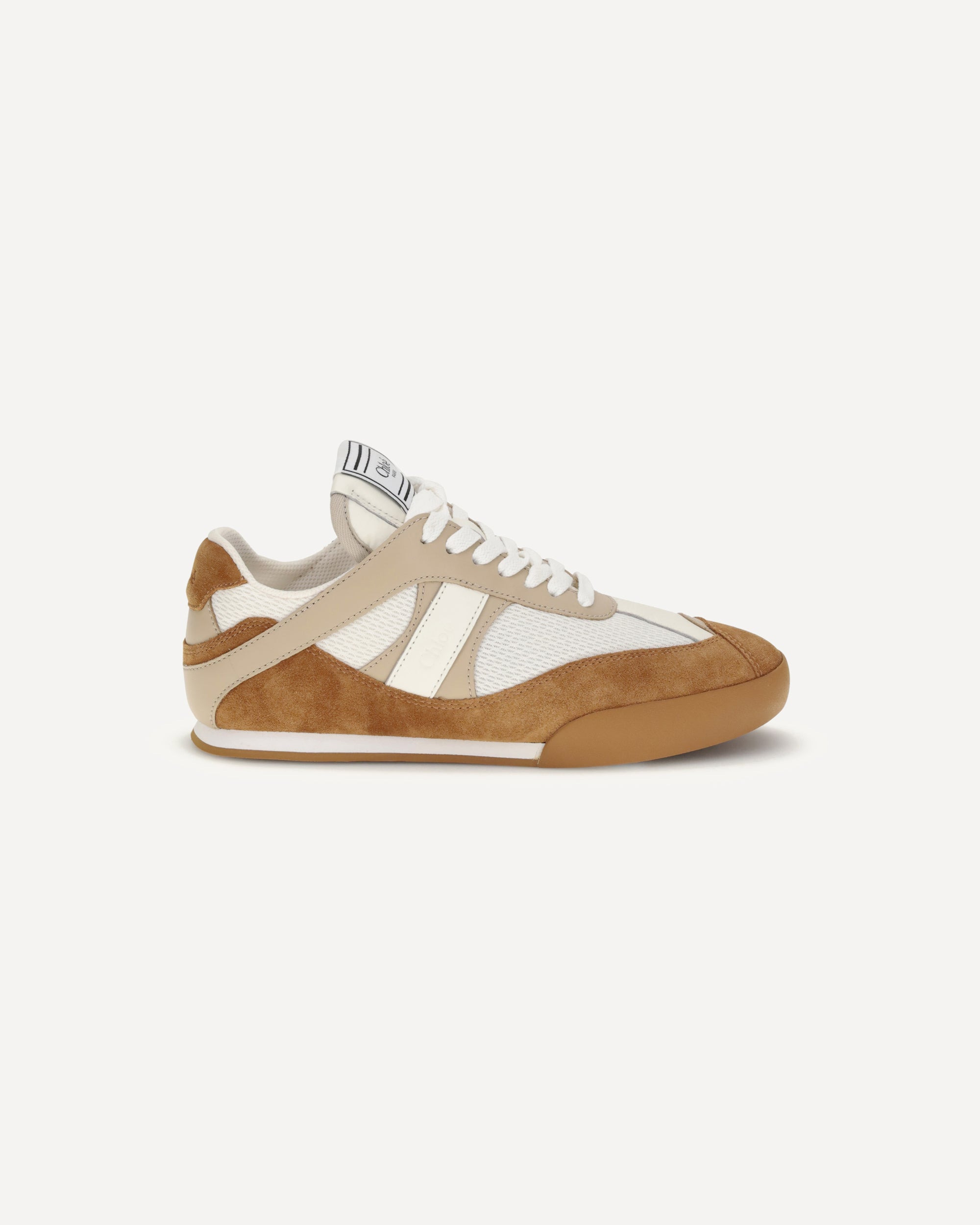 The Kick Sneakers by Chloe are inspired by the worlds of ballet and boxing. Made from recycled technical mesh and a mix of smooth and suede calfskin, they feature an updated design with a lighter silhouette and the Chloe logo embossed on the sides and back.Comfortable and functional, they combine a recycled sole with an inner wedge for added height and support. The boxing-style label with the Chloe logo completes the look with a distinctive touch. DETAILS - Sku: CH25W07IVD_25X - Season: AW25 - Composition: GENERAL 60% Calf Leather Bos Taurus 40% Polyester