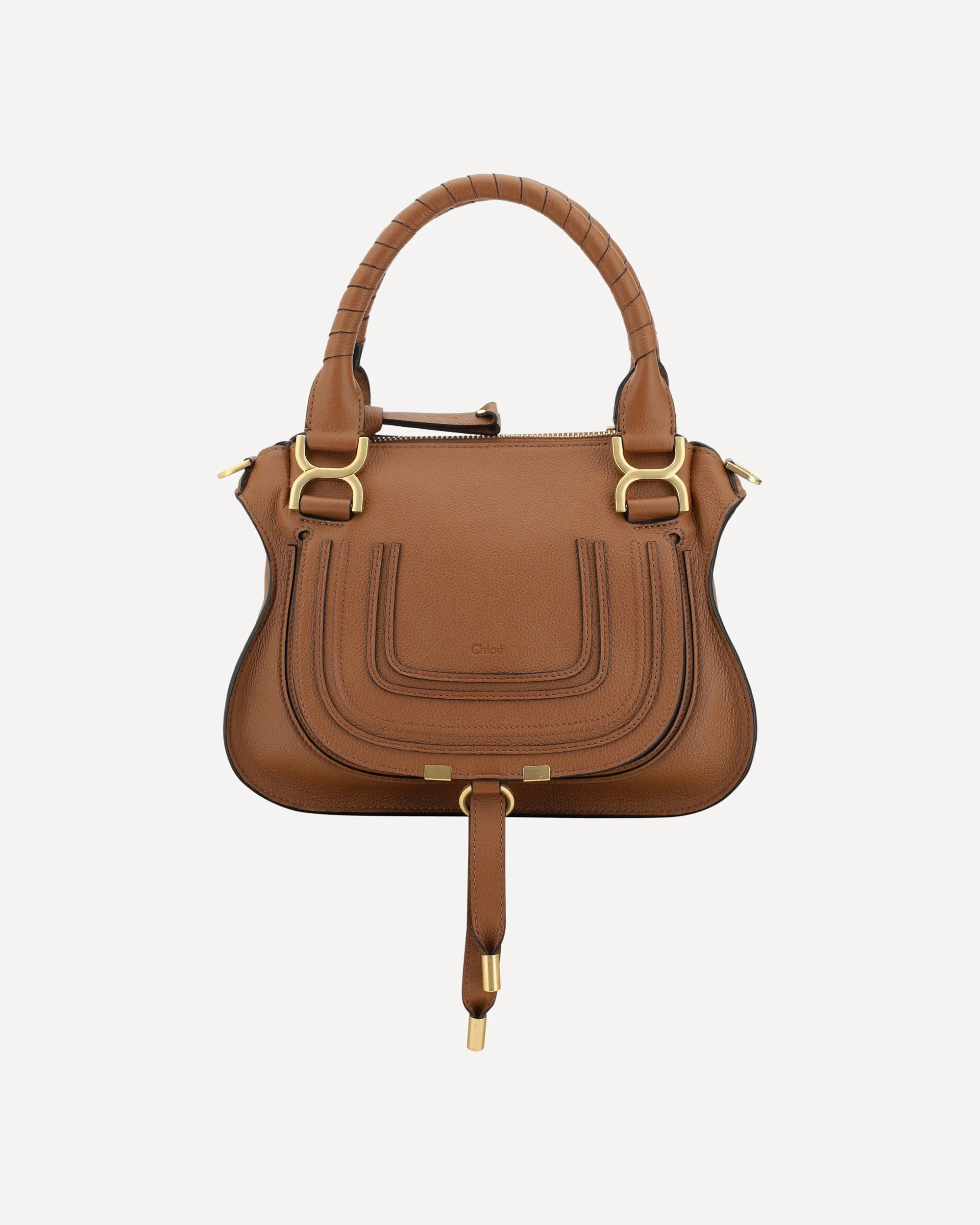 Calfskin Marcie Handbag by Chloe, double rigid leather top handle, removable and adjustable leather shoulder strap, top zipper closure, front flap with iconic leather tassel detail, iconic brand monogram press-stamped on front, open front pocket hidden by flap, single interior compartment. DETAILS sku CHC22AS628I31_25M composition: CALF LEATHER BOS TAURUS 100% color group: BROWN gender: WOMAN season: SS25 size chart: UNI category name: SHOULDER BAGS dimensions: 23 x 30 x 9 cm
