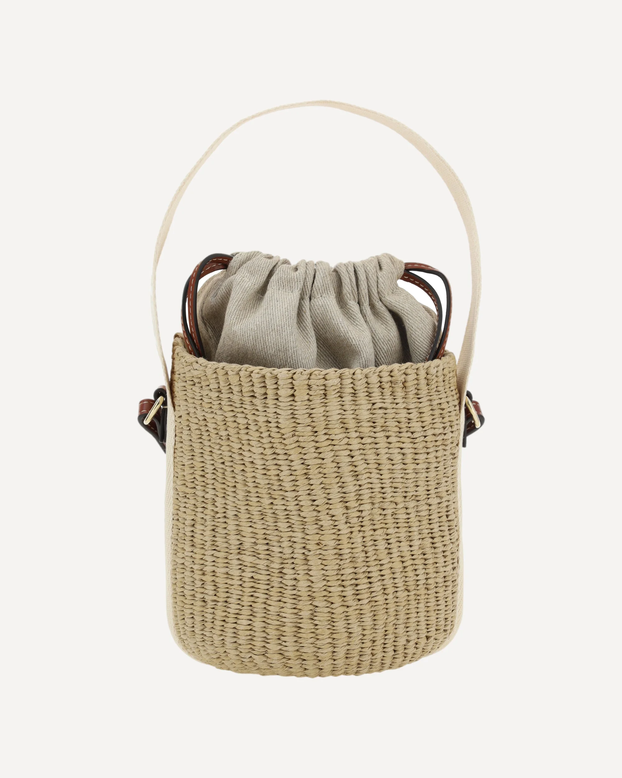 The Mifuko Bucket Bag by Chloe combines craftsmanship and contemporary style. Made of raffia, it features an interior pouch with drawstring closure, cotton handle with contrasting repeated logo and fixed leather shoulder strap. A leather welt pocket with press-stamped logo completes the design, making the accessory practical and distinctive. DETAILS - Sku: CHC22SS381G55_101 - Season: SS26 - Dimension: 13x13x13 - Composition: GENERAL 5% Cotton 90% Other Fibres 5% Calf Leather Bos Taurus - MADE IN TURKEY