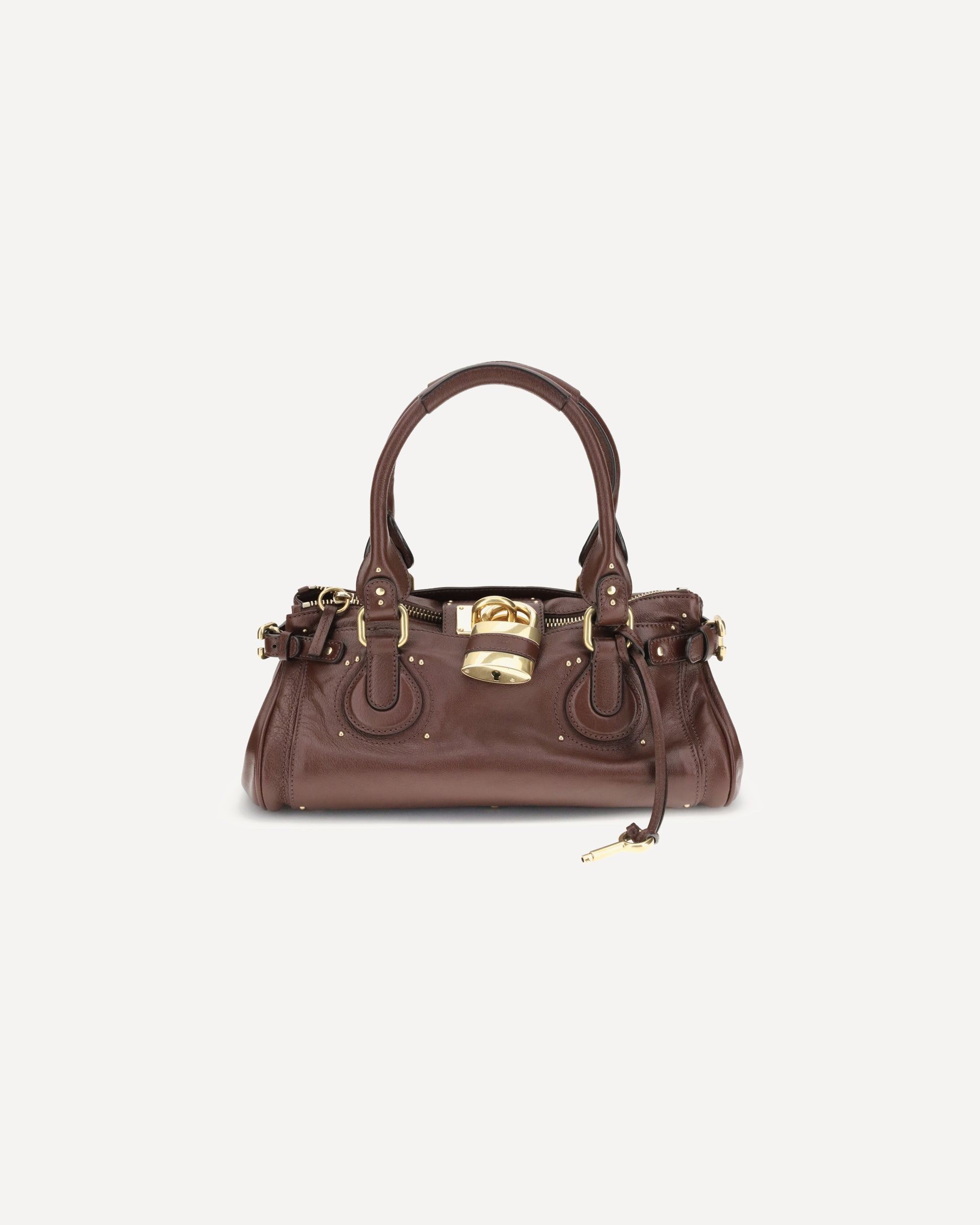 The Paddington Bag in garnet leather by Chloe is crafted from buffalo leather with suede leather details. Equipped with an aluminum lock, it can be carried by hand or over the shoulder. It features a main compartment, flat front and back pockets, an internal zip pocket, and a zip closure. DETAILS - Sku: CH25WS802P75_27M - Season: AW25 - Dimension: 36x36x18 - Composition: GENERAL 99% Buffalo 1% Leather - MADE IN ITALY