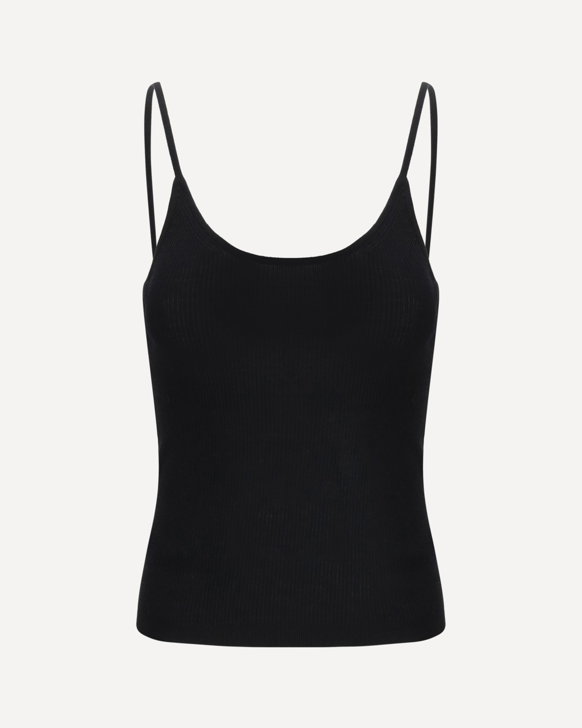 Chloe's wool Top features thin straps and a ribbed design that enhances its structure. The three-dimensional plaque with the brand's iconic logo applied in contrast on the front adds a distinctive and refined touch. The monochrome pattern makes the garment versatile and elegant, perfect for creating a sophisticated and modern look. DETAILS sku CH24WMP47667_001 composition: WOOL 100% color group: BLACK gender: WOMAN season: SS25 size chart: STANDARD category name: TOP