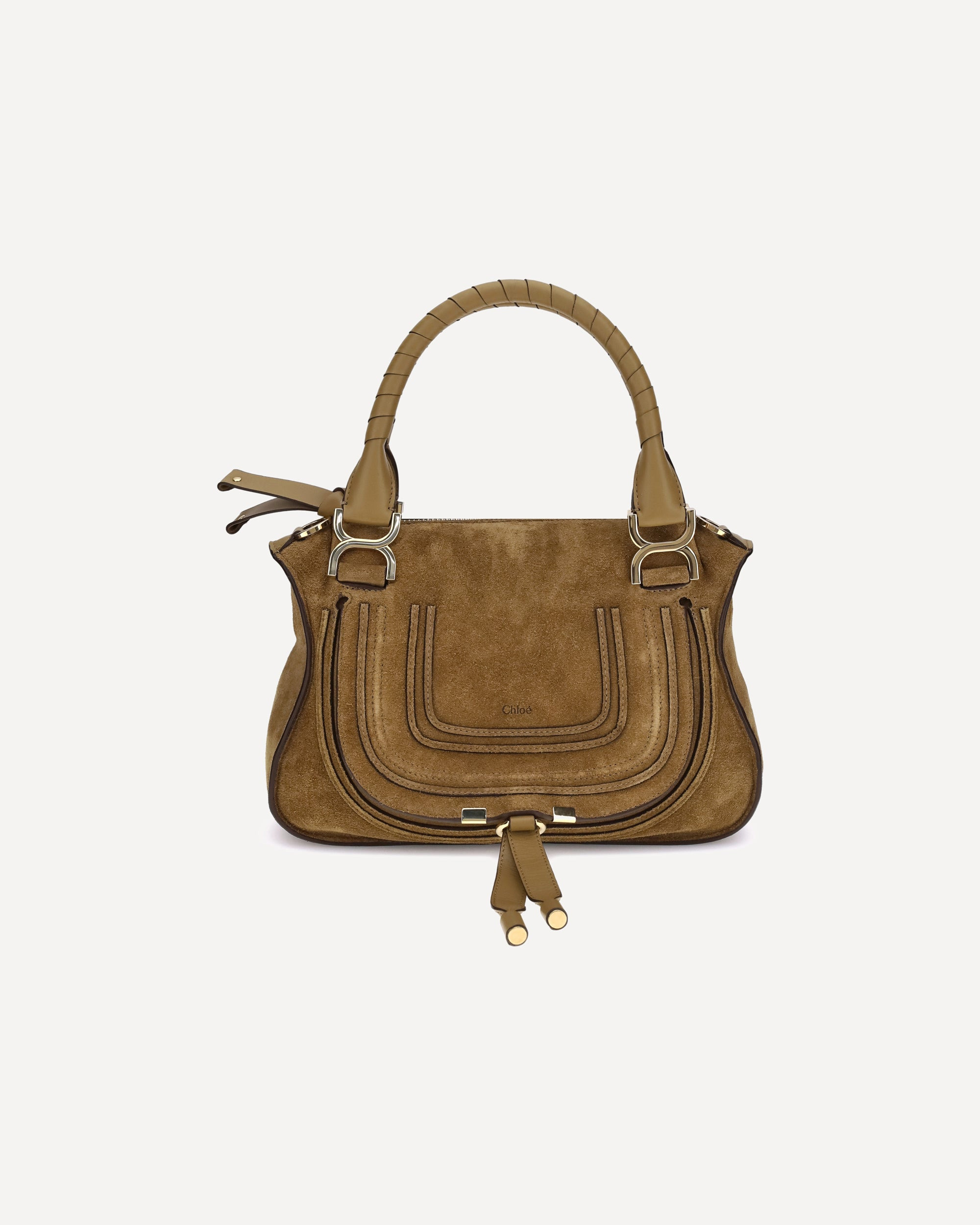 Marcie small suede Shoulder Bag by Chloe, double rigid top handle in leather, removable and adjustable leather shoulder strap, top zip closure, front flap with iconic leather tassel detail, iconic brand monogram press-studded on the front, open front pocket hidden by the flap, single internal compartment. DETAILS - Sku: CH25AS628Q07_21B - Season: AW25 - Dimension: 30x30x9 - Composition: GENERAL 100% Calf Leather Bos Taurus - MADE IN ITALY