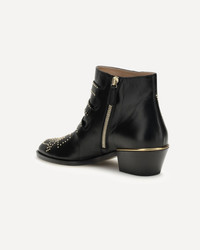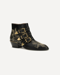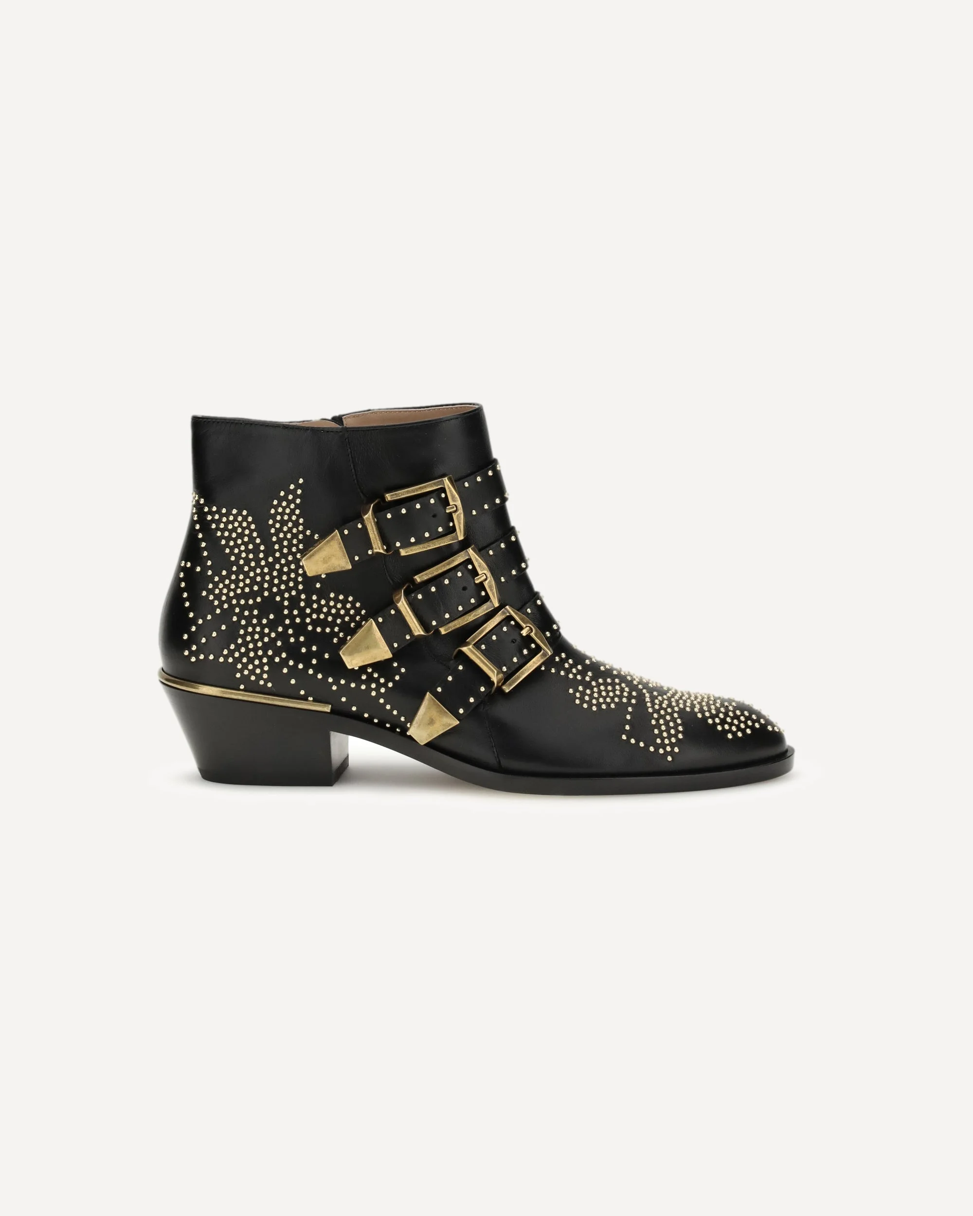 The Susan Boots by Chloe are an iconic expression of rock-chic sophistication. Crafted from smooth leather, they feature micro metal studs and three decorative straps that define their bold silhouette. A side zip closure ensures ease of wear, while the leather lining and insole offer lasting comfort. Finished with a leather sole and true-to-size fit, these boots effortlessly balance edge and elegance. DETAILS - Sku: CHC16A13475_0ZY - Season: SS26 - Composition: UPPER 100% Calf Suede SOLE 100% Calf Suede - MADE IN ITALY