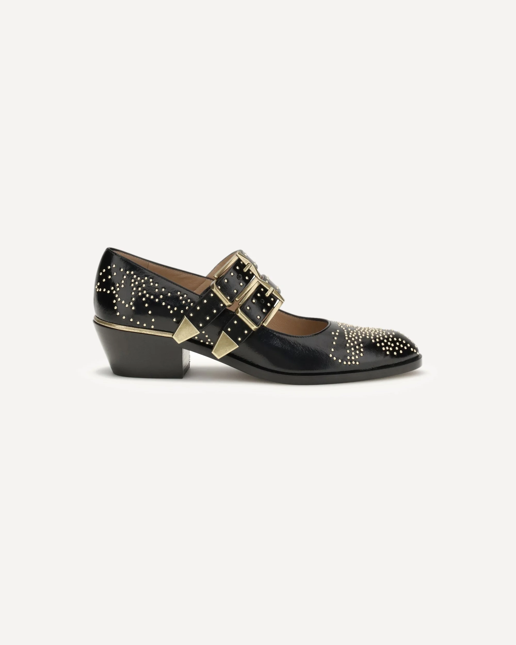 The Susanna Pumps by Chloe reinterpret the Maison’s iconic boots in a refined, feminine silhouette. Crafted from shiny calfskin, they feature the signature elongated toe adorned with gold-tone metal studs and mini buckles, echoing the line’s western-inspired spirit. A Cuban heel paired with a thick sole adds attitude and stability, giving the shoe a bold yet elegant character. A distinctive style that blends rock-infused charm, craftsmanship, and timeless appeal. DETAILS - Sku: CH26S16WWF_001 - Season: SS26 - Composition: UPPER 100% Calf Leather Bos Taurus SOLE 100% Calf Leather Bos Taurus - MADE IN SPAIN