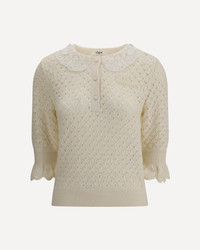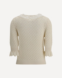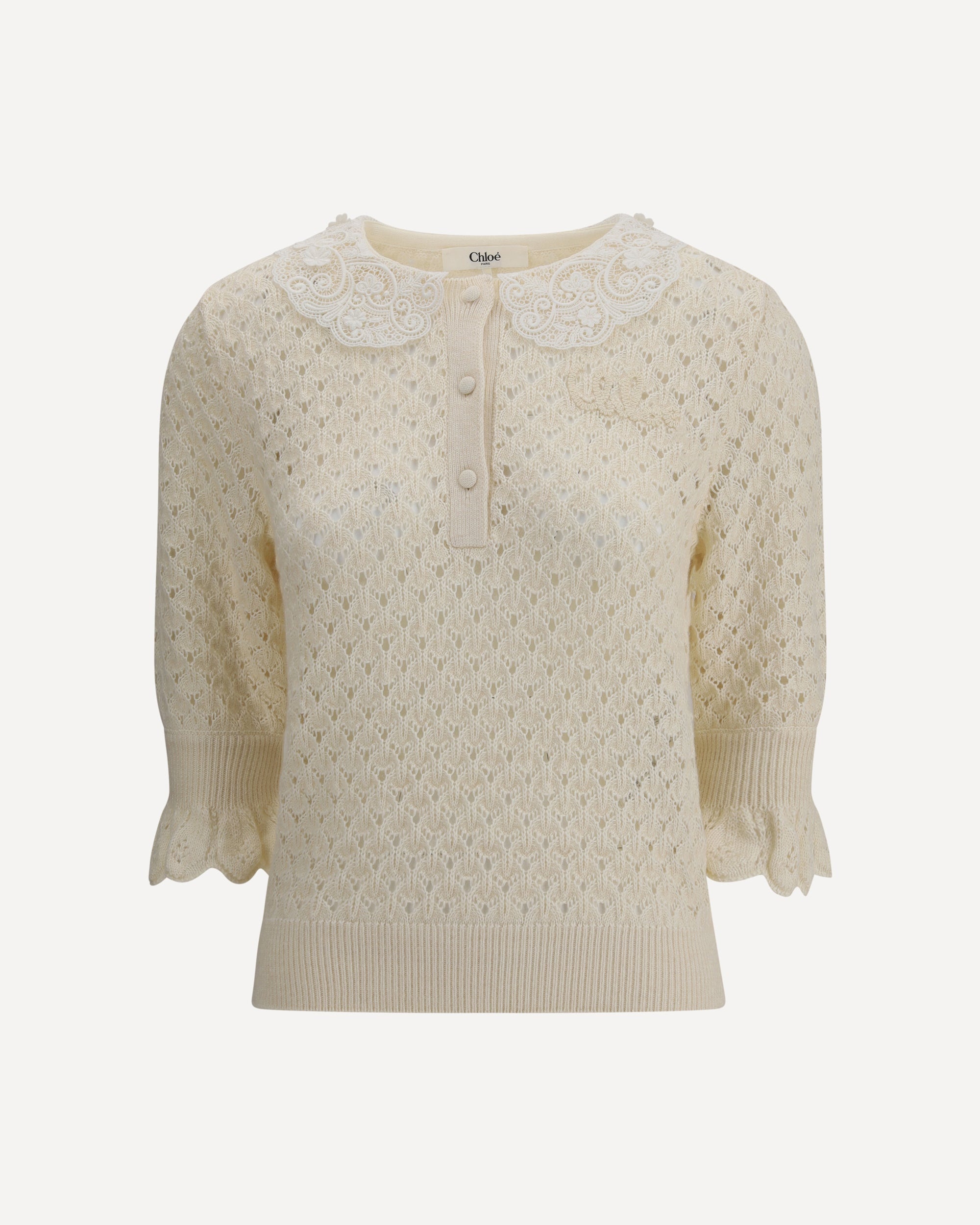 Chloe Sweater is a refined piece that combines delicacy and craftsmanship. It features a distinctive embroidered collar that adds a touch of elegance, and a mid-bust front button closure that defines the style. The openwork knit design lends a light and sophisticated texture. The 3/4 sleeves are embellished with scalloped ruffle cuffs, adding a romantic and feminine detail, while the ribbed hem completes the garment with a curated finish. DETAILS - Sku: CH25AMP47590_107 - Season: AW25 - Fit: Regular - Composition: GENERAL 72% Cotton 17% Alpaca Vicugna Pacos 11% Silk - MADE IN ITALY