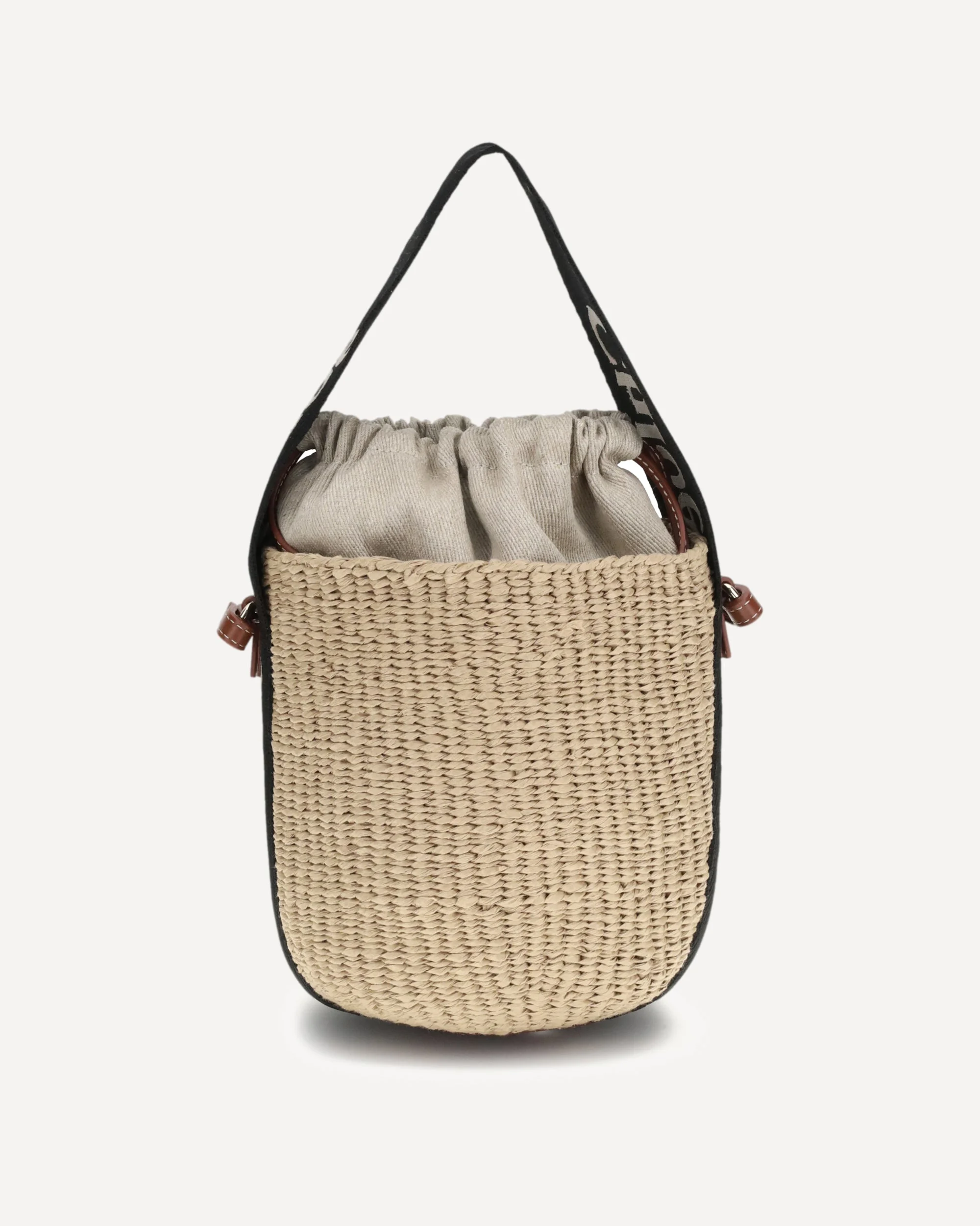 The Woody Raffia Bucket Bag from Chloe is a refined and versatile accessory. With a contrasting double flat handle and extensions on the front and back, it offers a stylish and functional design. The interior compartment, made of fabric, features an adjustable drawstring for secure closure. The brand's iconic logo is applied to the extensions, while the removable thin leather shoulder strap adds convenience and practicality. DETAILS - Sku: CHC23AS381L18_915 - Season: SS26 - Dimension: 17x17x16 - Composition: GENERAL 100% Raffia - MADE IN TURKEY