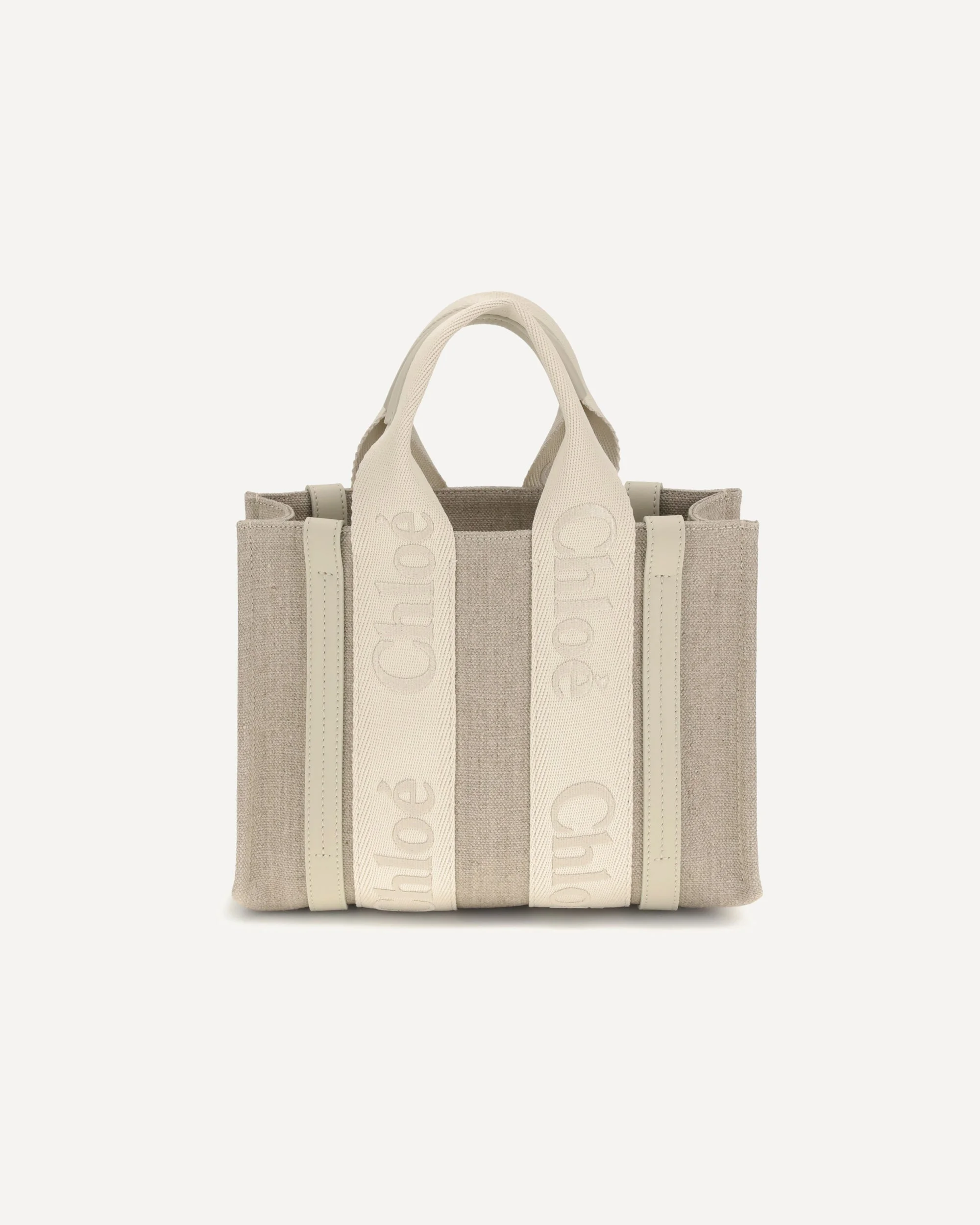 Chloe's Woody Handbag is an elegant and practical accessory made of linen and detailed with contrasting leather. The concealed button top closure maintains a clean design, while the double flat handles and extension on the leather side panels add sophistication. The removable and adjustable leather shoulder strap also allows it to be carried on the shoulder, offering versatility. Inside, a welt pocket keeps smaller items tidy, while the brand's iconic signature is affixed to the side panels, lending a distinctive touch. DETAILS - Sku: CHC23AS397L17_20S - Season: AW25 - Dimension: 26.5x26.5x8 - Composition: GENERAL 100% Linen - MADE IN ITALY