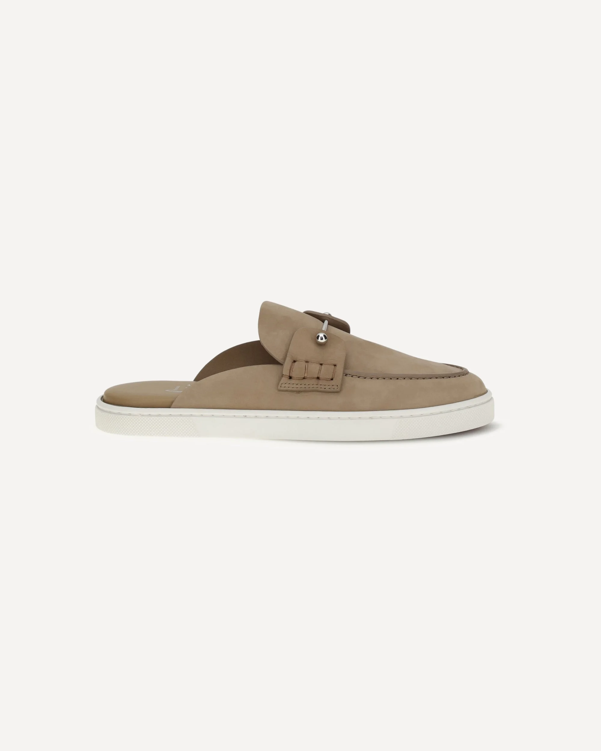 The Chanme Mules Loafers by Christian Louboutin are an elegant open-back style with a soft and refined construction, designed for urban and contemporary elegance. The tongue is embellished with a hand-stitched banner and a metal pin on the collar, details that express the Maison's creative touch. Crafted from beige Lionne reverse calfskin, lightweight and flexible, they are finished with a white rubber sole for comfort and everyday practicality. DETAILS - Sku: 1260789_F486 - Season: SS26 - Composition: UPPER 100% Calf Leather Bos Taurus SOLE 100% Rubber - MADE IN ITALY