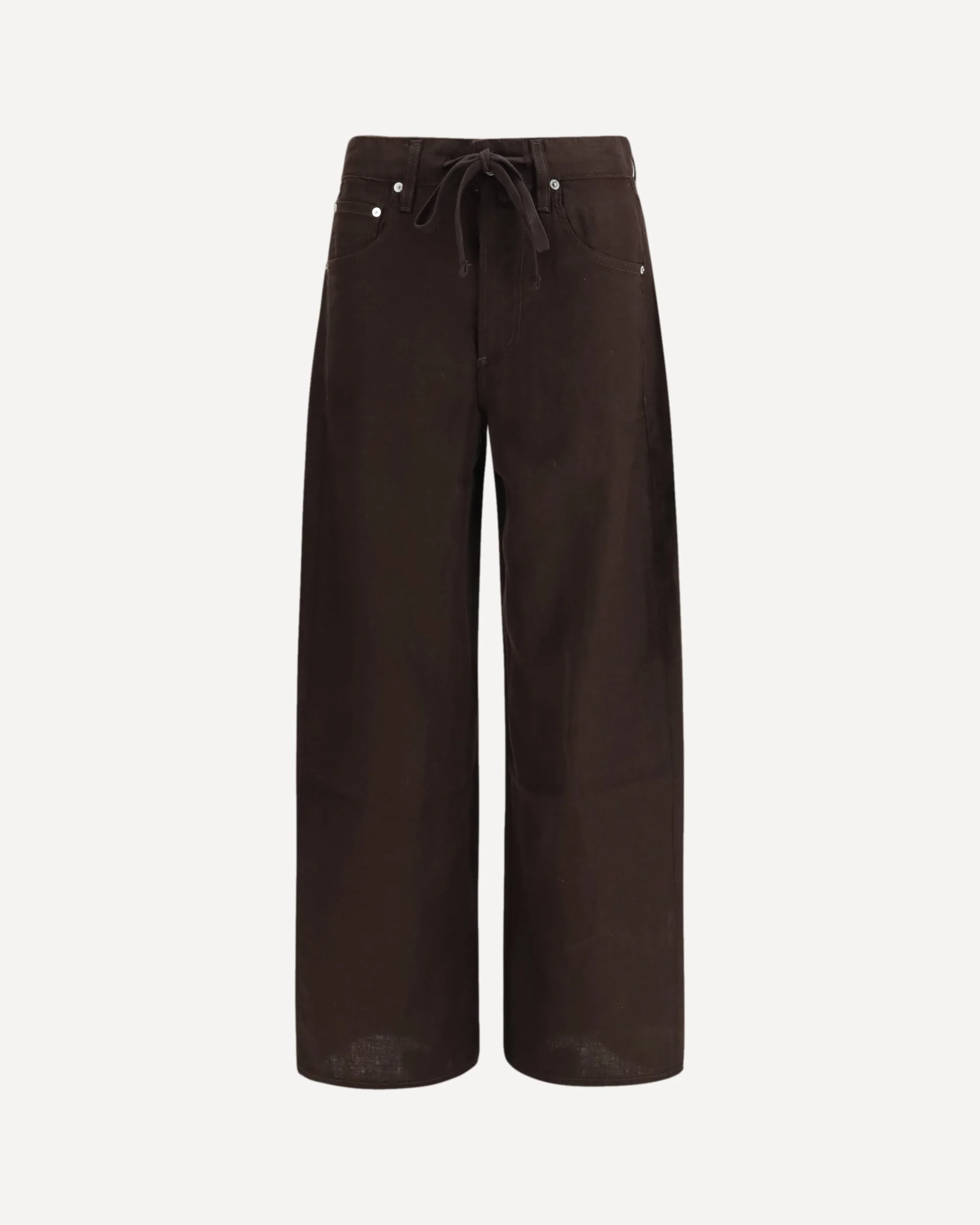 The Brynn drawstring Pants by Citizens of Humanity are made from linen, a lightweight and breathable material that is perfect for the summer season. The zipper, button, and drawstring closure offers an adjustable fit, while the 5-pocket style, with two side welt pockets, adds practicality and functionality. With a mid-rise waist, these pants combine comfort and casual style, ideal for a relaxed yet polished look. Perfect to pair with a simple T-shirt or shirt for a versatile and chic outfit. DETAILS - Sku: 21441761_CHOCO - Season: SS26 - Fit: Regular - Composition: GENERAL 100% Linen - MADE IN U.S.A.