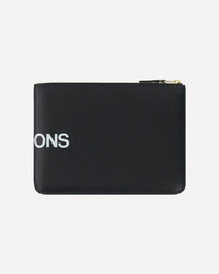 Red Calfskin Pouch by Comme des Garçons, featuring white logo printed on front continuing on back, engraved golden logo on front, zip closure with one internal compartment. DETAILS sku SA5100HL_1 color : BLACK gender : MAN season : SS23 size chart : MAN UNI category name : WALLETS made in : MADE IN SPAIN