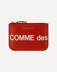 Calfskin Mini Pouch by Comme des Garçons, featuring white logo printed on front continuing on back, engraved golden logo on front, zip closure and one internal compartment. DETAILS sku SA8100HL_2 color : RED gender : MAN season : SS23 size chart : MAN UNI category name : WALLETS made in : MADE IN SPAIN