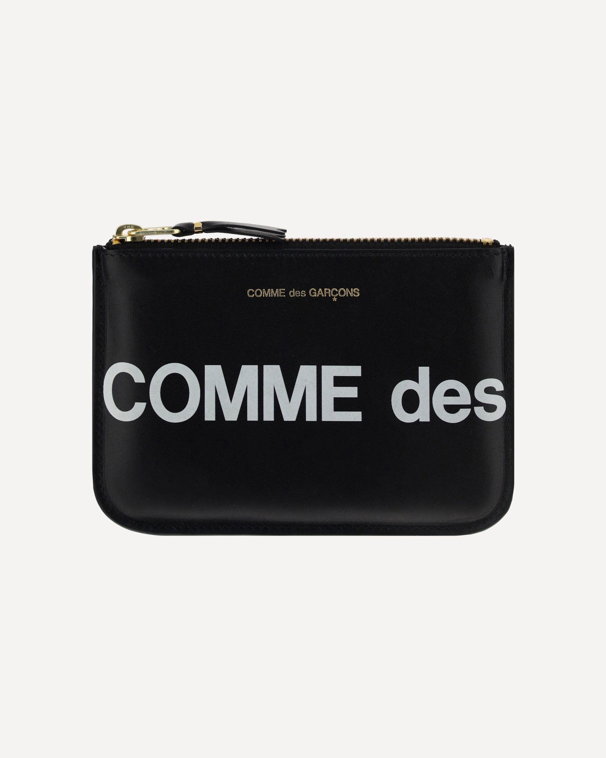 Calfskin Mini Pouch by Comme des Garçons, featuring white logo printed on front continuing on back, engraved golden logo on front, zip closure and one internal compartment. DETAILS sku SA8100HL_1 color : BLACK gender : MAN season : SS23 size chart : MAN UNI category name : WALLETS made in : MADE IN SPAIN