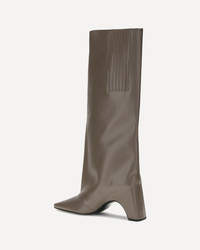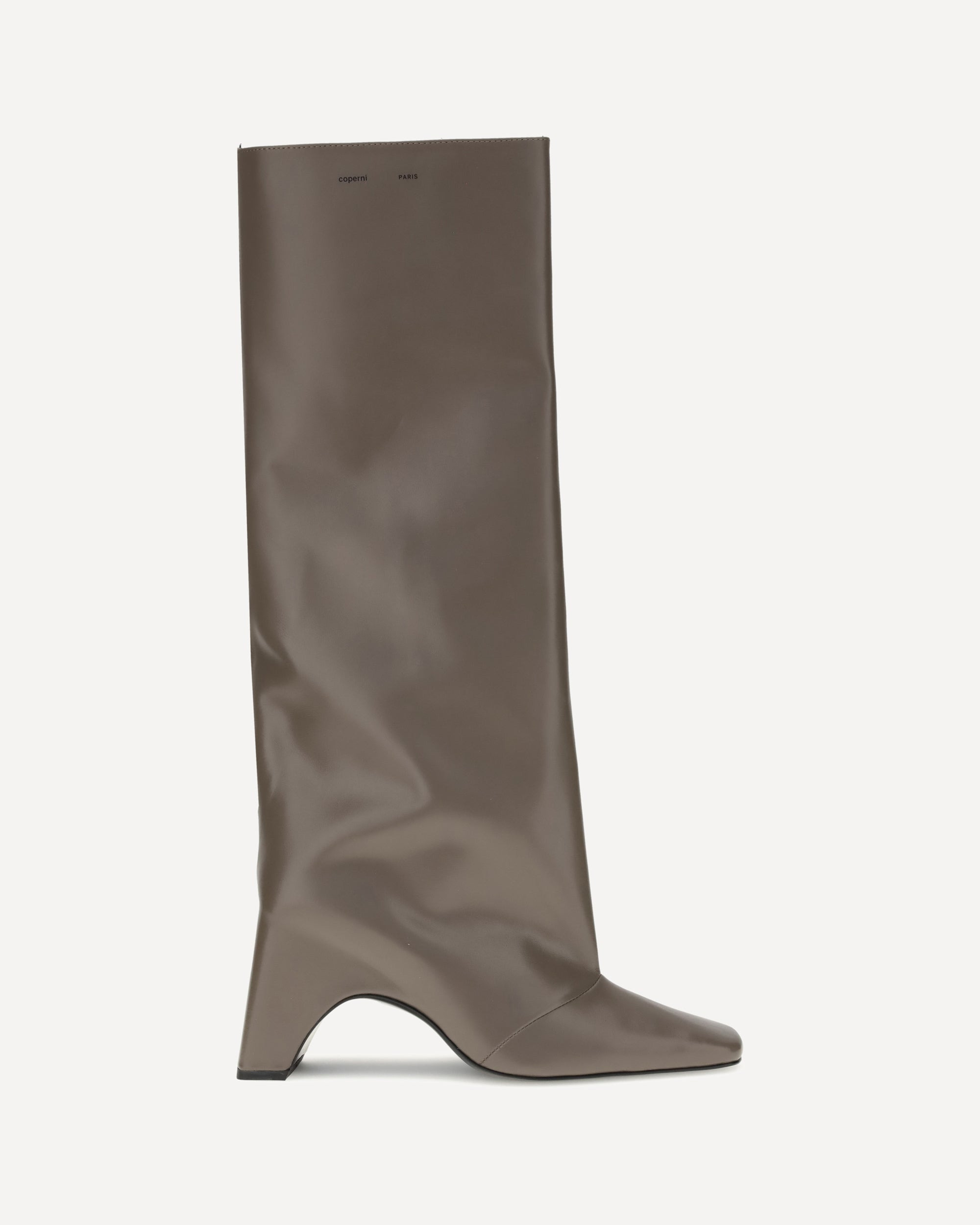 Coperni's Bridge High Boots are distinguished by a structured silhouette featuring a subtle triangular line that elegantly enhances the leg. The name comes from the arched sole, while the design is complemented by a block heel and a minimalist square toe for a sophisticated, contemporary look. DETAILS - Sku: COPSH03F6004_BRW - Season: AW25 - Composition: GENERAL 100% Calf Leather Bos Taurus - MADE IN SPAIN