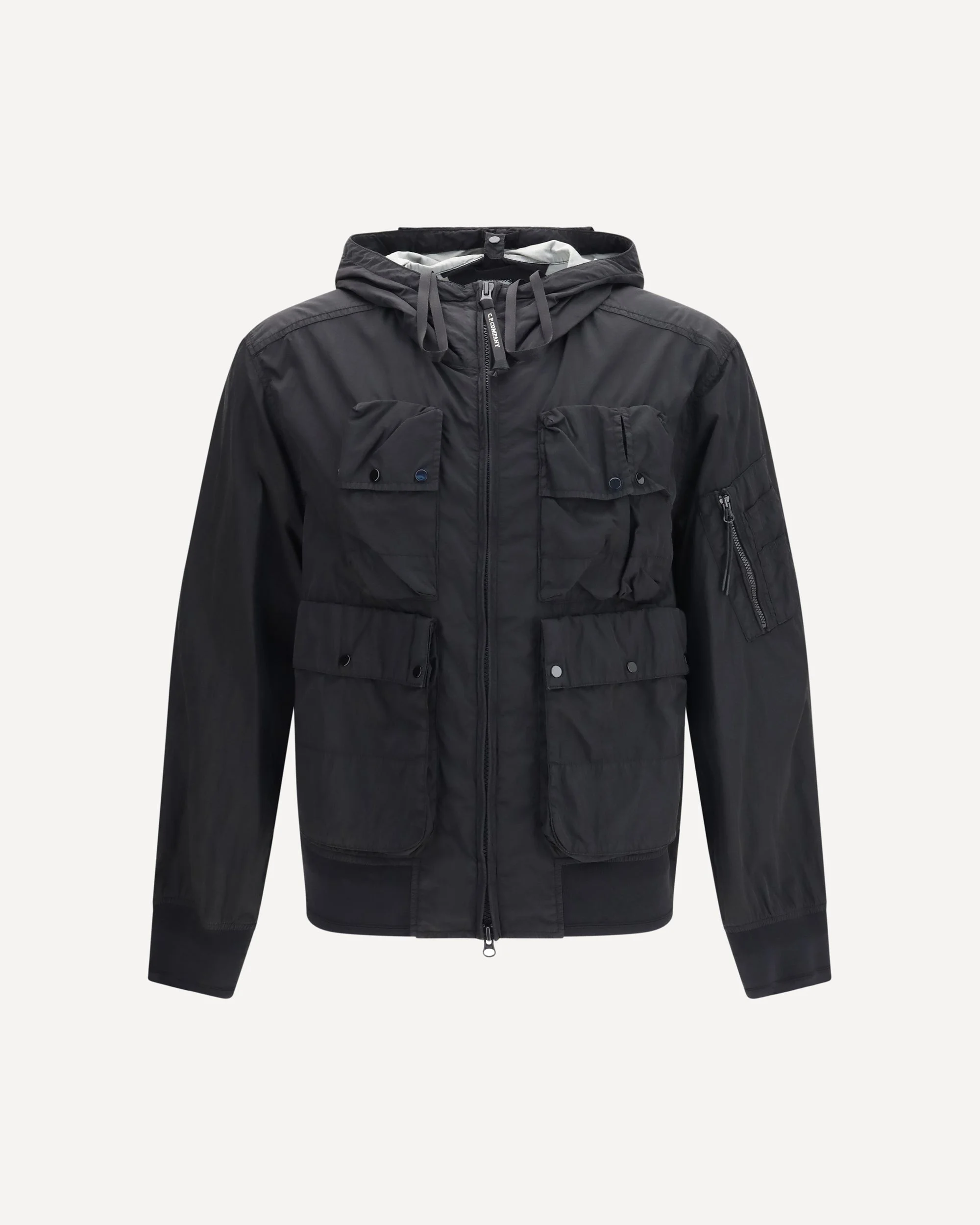 The Chrome-R Goggle Jacket by C.P. Company is crafted from Chrome-R, a glossy 100% recycled multifilament nylon made from recovered and regenerated production waste and certified by the Global Recycled Standard (GRS). The design features the brand’s iconic adjustable Goggle hood and a front double-slider full-zip closure. Chest and front pockets with flap and snap buttons are paired with a zipped sleeve pocket that highlights the brand’s functional aesthetic. Ribbed cuffs and hem along with cotton interior details complete the garment, while the garment-dyed finish creates unique tonal shades that develop character over time. The regular fit ensures comfort and versatility for a contemporary look. DETAILS - Sku: 20CMOW005A005904D_999 - Season: SS26 - Fit: Regular - Composition: OUTER 100% Polyamide INNER 100% Cotton - MADE IN CHINA