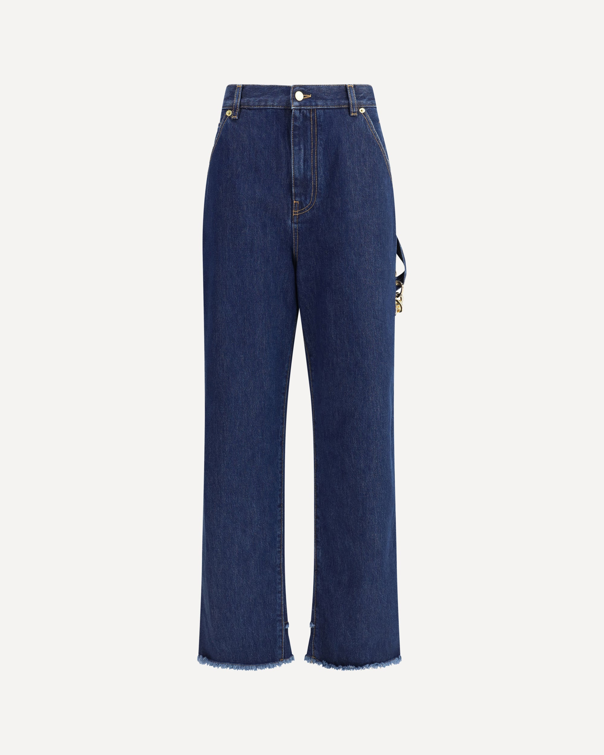 Darkpark's chain Jeans reinterpret denim with a bold, contemporary aesthetic. Featuring a front button-and-zip closure, they feature a loose five-pocket design and a distinctive detail: a gold chain applique at the waist. The raw-cut bottom adds a raw and urban touch, perfect for an impactful look with a strong character. DETAILS - Sku: WTR58DBL03W019_W019 - Season: AW25 - Fit: Regular - Composition: GENERAL 100% Cotton - MADE IN ITALY