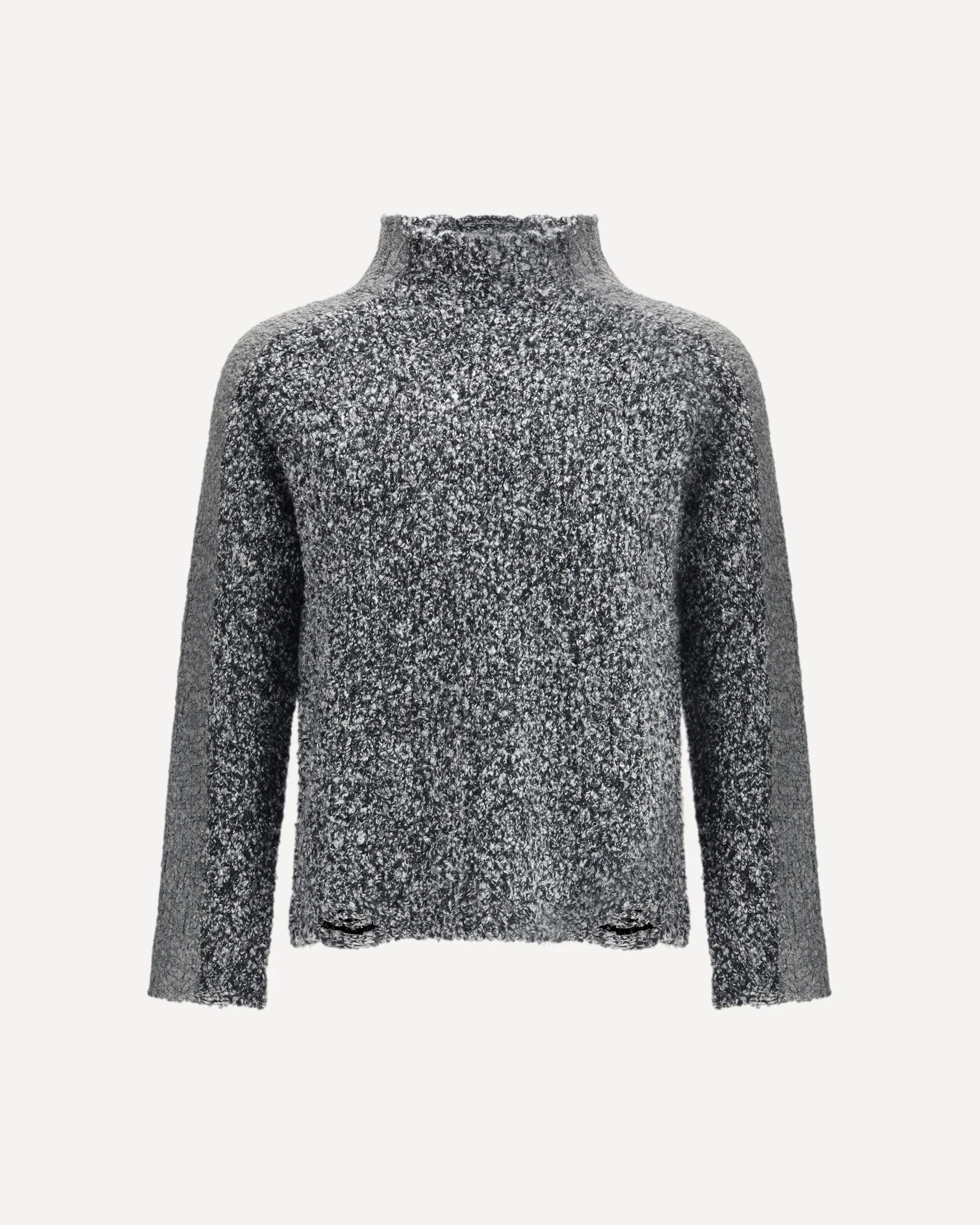 The K-Erland Sweater by Diesel is an exclusive piece from the Fall Winter 2025 collection, offering a modern take on traditional boucle tweed tailoring. Crafted from a mouline wool-blend boucle yarn, it features an irregular speckled texture, a funnel neck, and a regular fit. The printed sleeve bands add a sporty and disruptive edge, embodying Diesel’s bold and innovative style. DETAILS - Sku: A214410EGCB_900C - Season: AW25 - Fit: Regular - Composition: GENERAL 87% Wool 13% Polyester - MADE IN ITALY