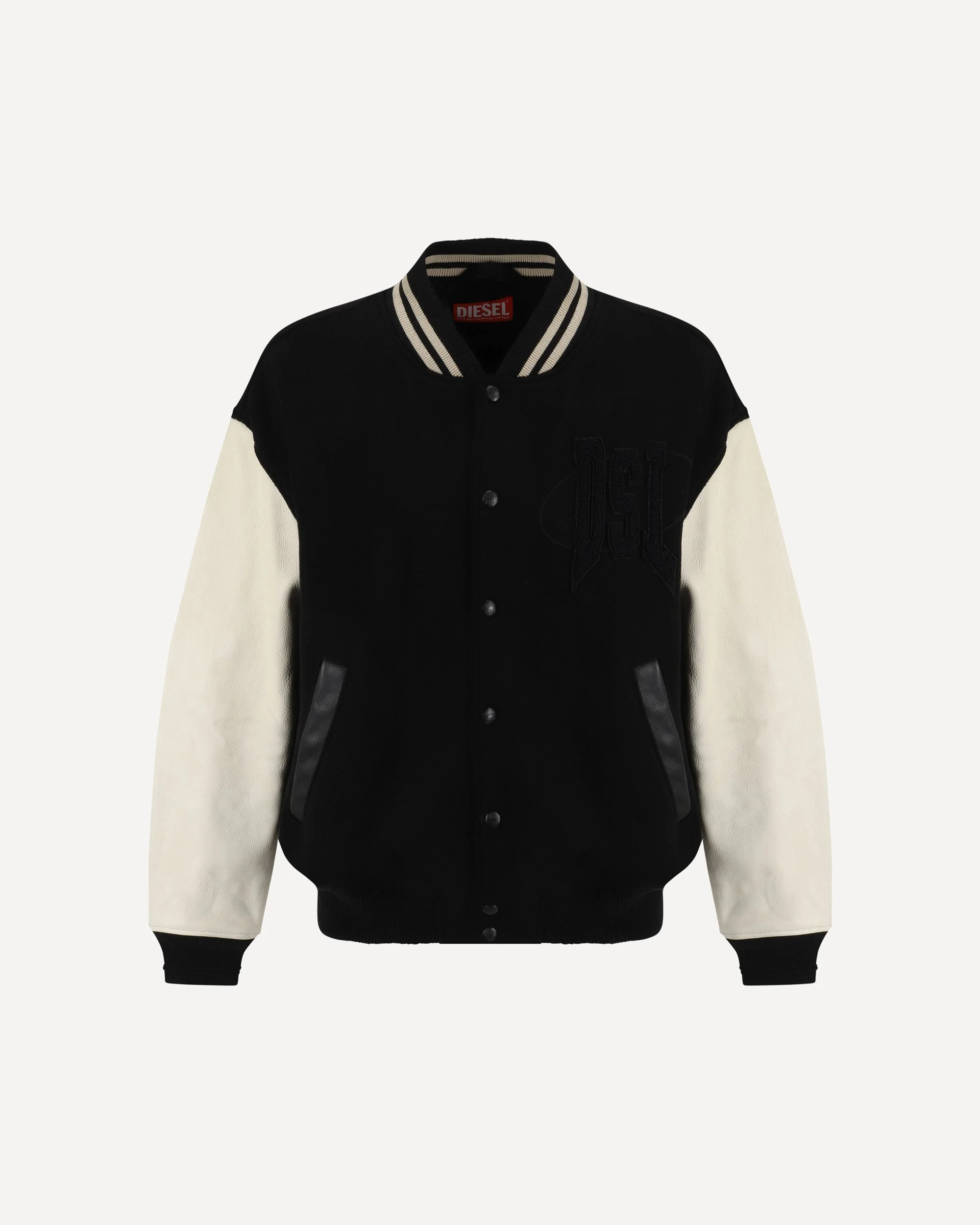 Wool L-Nyman Jacket by Diesel features ribbed collar, snap button front closure, ribbed cuffs, ribbed hem, two side welt pockets, contrast sleeves, iconic monogram on front and back, regular fit. DETAILS sku A144140LHAL_9XX composition: WOOL 81% NYLON 19% color group: MULTICOLOUR gender: MAN season: AW24 size chart: RTW IT category name: JACKETS