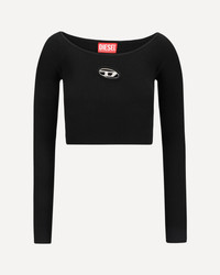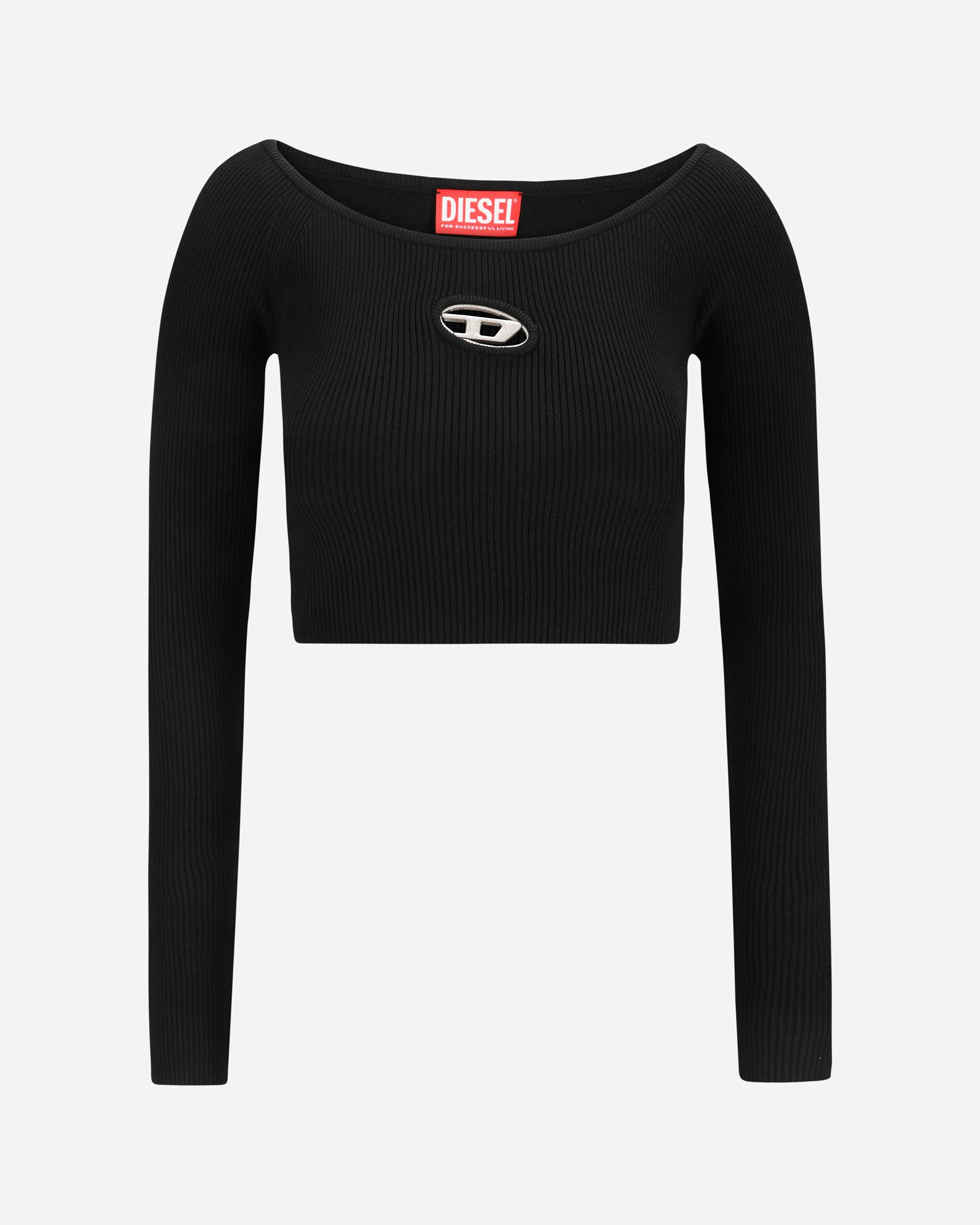 M-Vera-Ls Long Sleeve Jersey by Diesel, cropped pattern, all-over ribbed design, boat neck, cut-out detail with iconic three-dimensional brand logo plaque, monochrome pattern, slim fit. DETAILS sku A141890DLAX_9XX composition: RAYON 83% VISCOSE 17% color group: BLACK gender: WOMAN season: AW24 size chart: STANDARD category name: T-SHIRTS