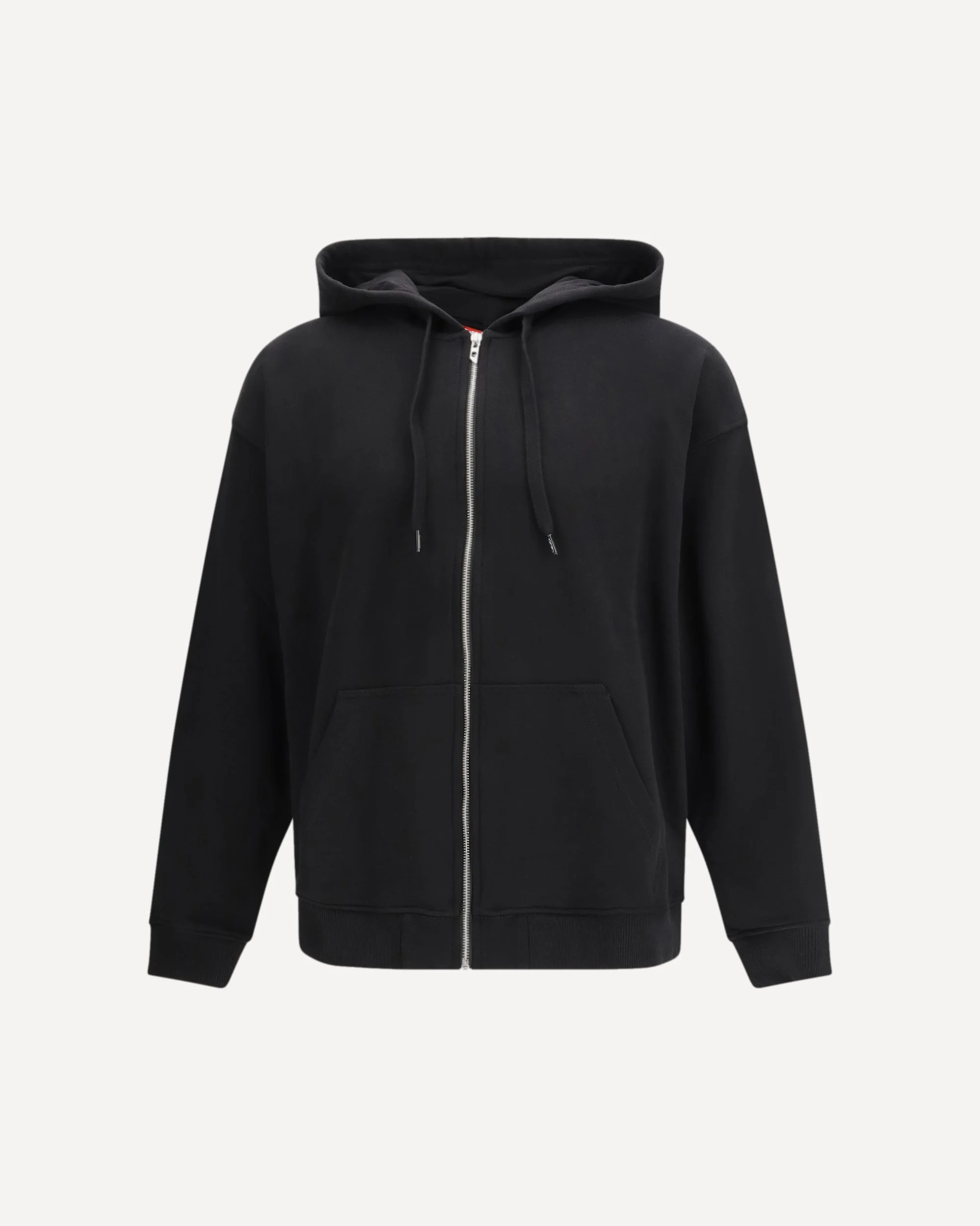 The S-Boxt-Zip-Hood-Div hooded Sweatshirt by Diesel delivers a relaxed take on modern sportswear. Crafted from soft, unbrushed organic cotton fleece, it features an easy, comfortable fit enhanced by a front metal zip with a D-logo puller. The drawstring hood, along with ribbed elasticated cuffs and hem, ensures everyday comfort and practicality. Embroidered Diesel Denim Division logo patches on the left sleeve add a distinctive, iconic touch rooted in the brand’s heritage. DETAILS - Sku: A200220GEAD_9XX - Season: SS26 - Fit: Regular - Composition: GENERAL 100% Cotton - MADE IN BANGLADESH