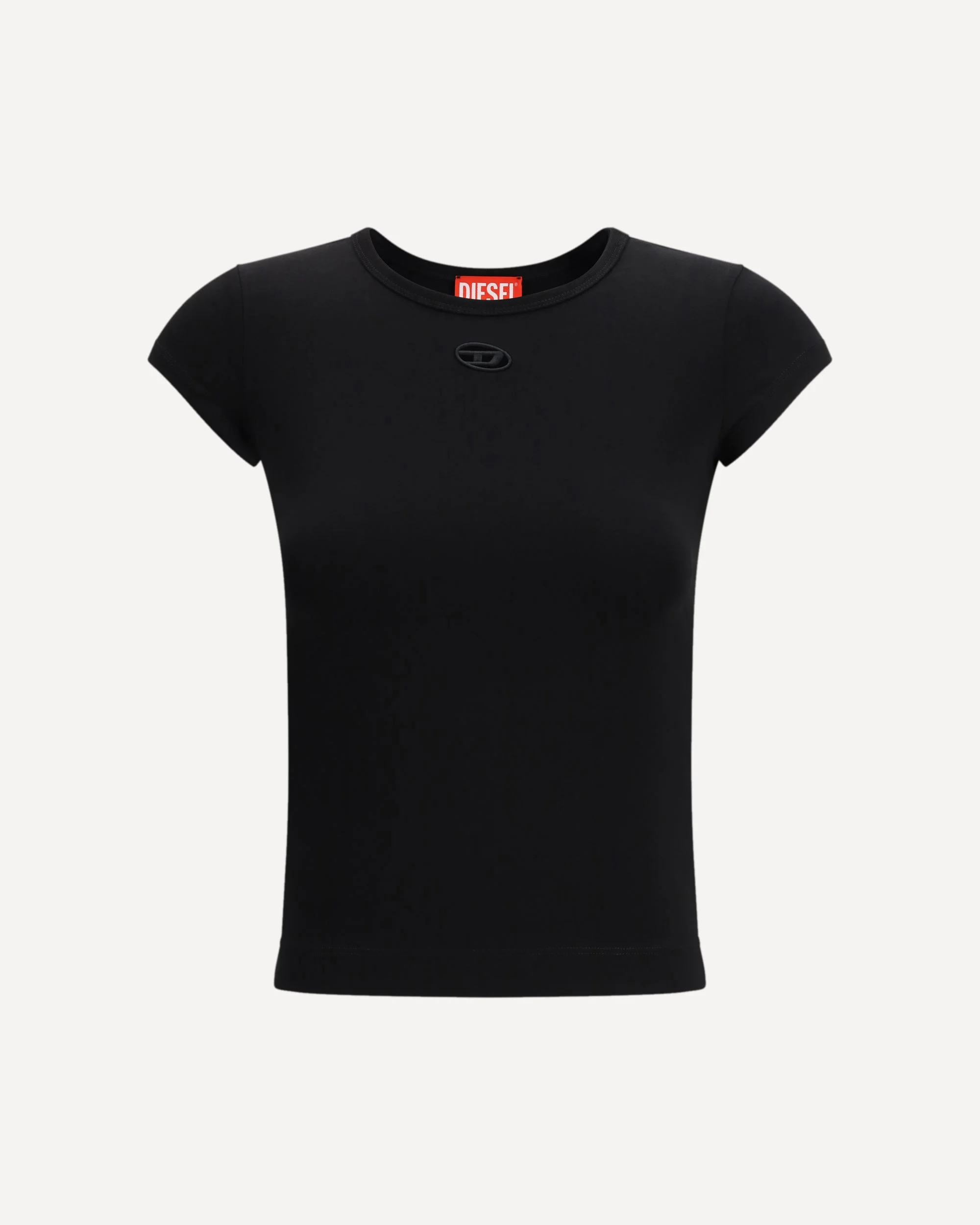 The T-Angie-Od T-shirt by Diesel refreshes a wardrobe essential through a bold, modern lens. Crafted from stretch cotton jersey, it provides a comfortable fit that follows the body with ease. The round neckline and short sleeves emphasize its clean silhouette, while the laser-cut Oval-D embroidery on the front stands out as a striking signature detail, embodying Diesel’s unmistakable graphic attitude. DETAILS - Sku: A199120AFAA_9XX - Season: SS26 - Fit: Slim - Composition: GENERAL 93% Cotton 7% Elastane - MADE IN CHINA