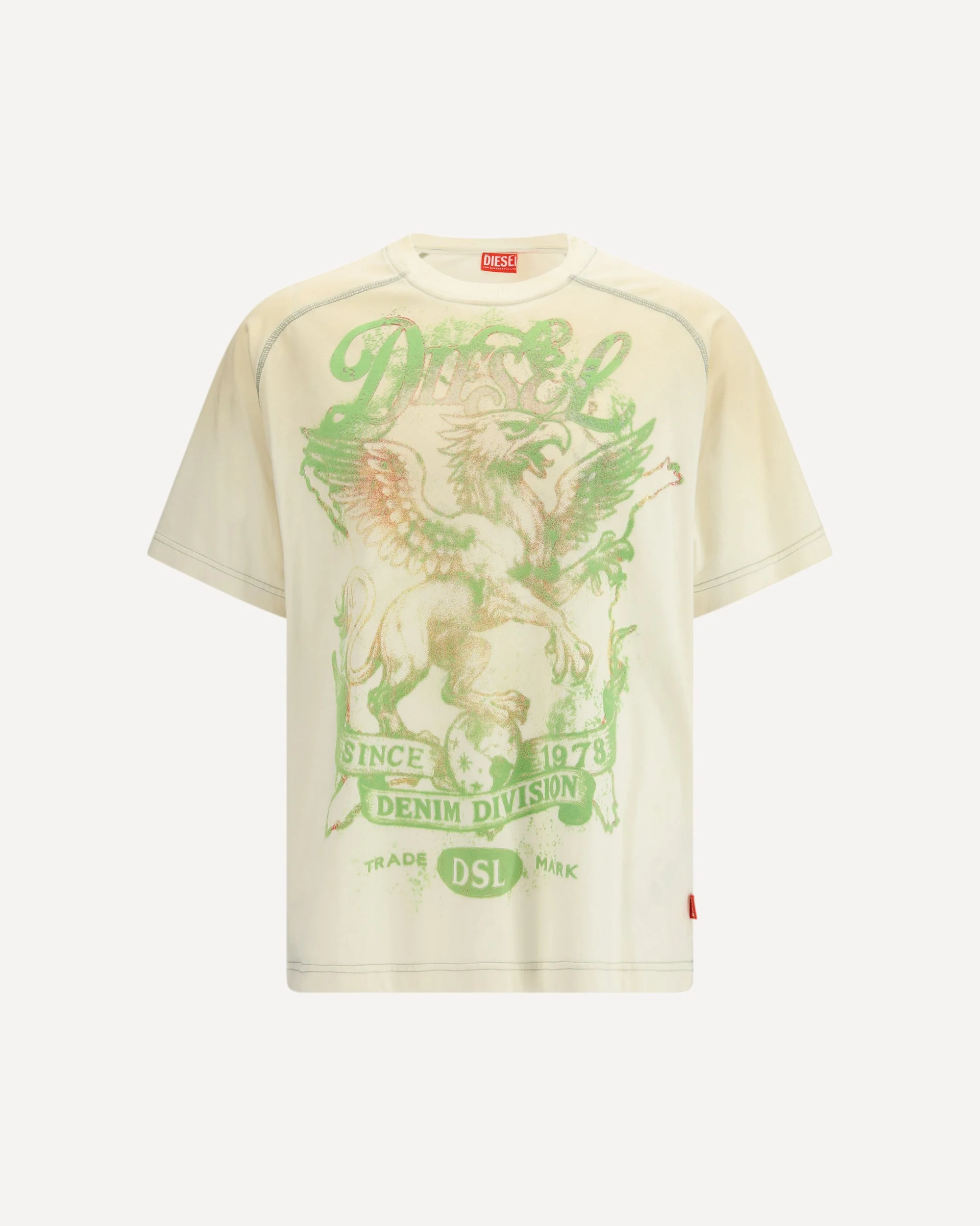 The T-Griffo T-shirt in organic cotton jersey with raglan cut and flocked griffin print from the Spring Summer 2026 Runway by Diesel embodies the brand’s experimental spirit through a bold and textured aesthetic. The organic cotton jersey enhances a dynamic construction, while the treated fabric creates a soft and shaded effect that adds visual depth. The dirty finish reinforces its lived-in appearance, giving the silhouette authentic character. This T-shirt by Diesel stands out as a statement of contemporary research and confident identity. DETAILS - Sku: A237990SKBK_1BN - Season: SS26 - Fit: Regular - Composition: GENERAL 100% Cotton - MADE IN BULGARIA