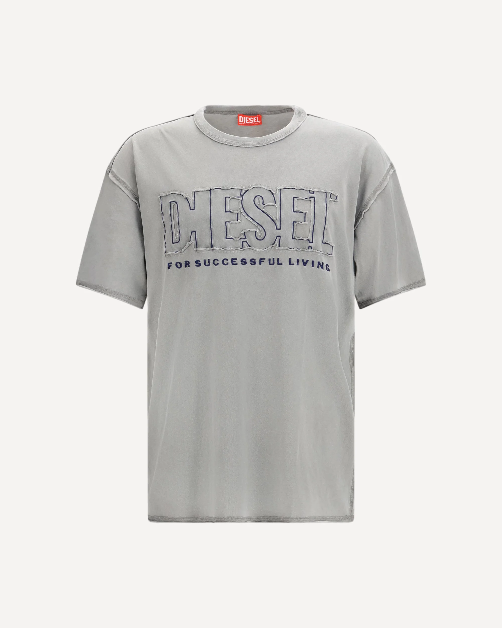 The T-rawboxt T-shirt by Diesel offers a relaxed look with a crew neck and short sleeves, made from organic cotton for sustainable comfort. The "Diesel For Successful Living" applique and embroidery on the front are enhanced by external stitching and raw-cut edges for a detailed, contemporary effect. Thanks to the garment dyeing process and acid wash, this T-shirt has a unique and distinctive effect, perfect for those looking for a mix of style and originality. DETAILS - Sku: A210410KMAH_97D - Season: SS26 - Fit: Regular - Composition: GENERAL 100% Cotton - MADE IN CHINA