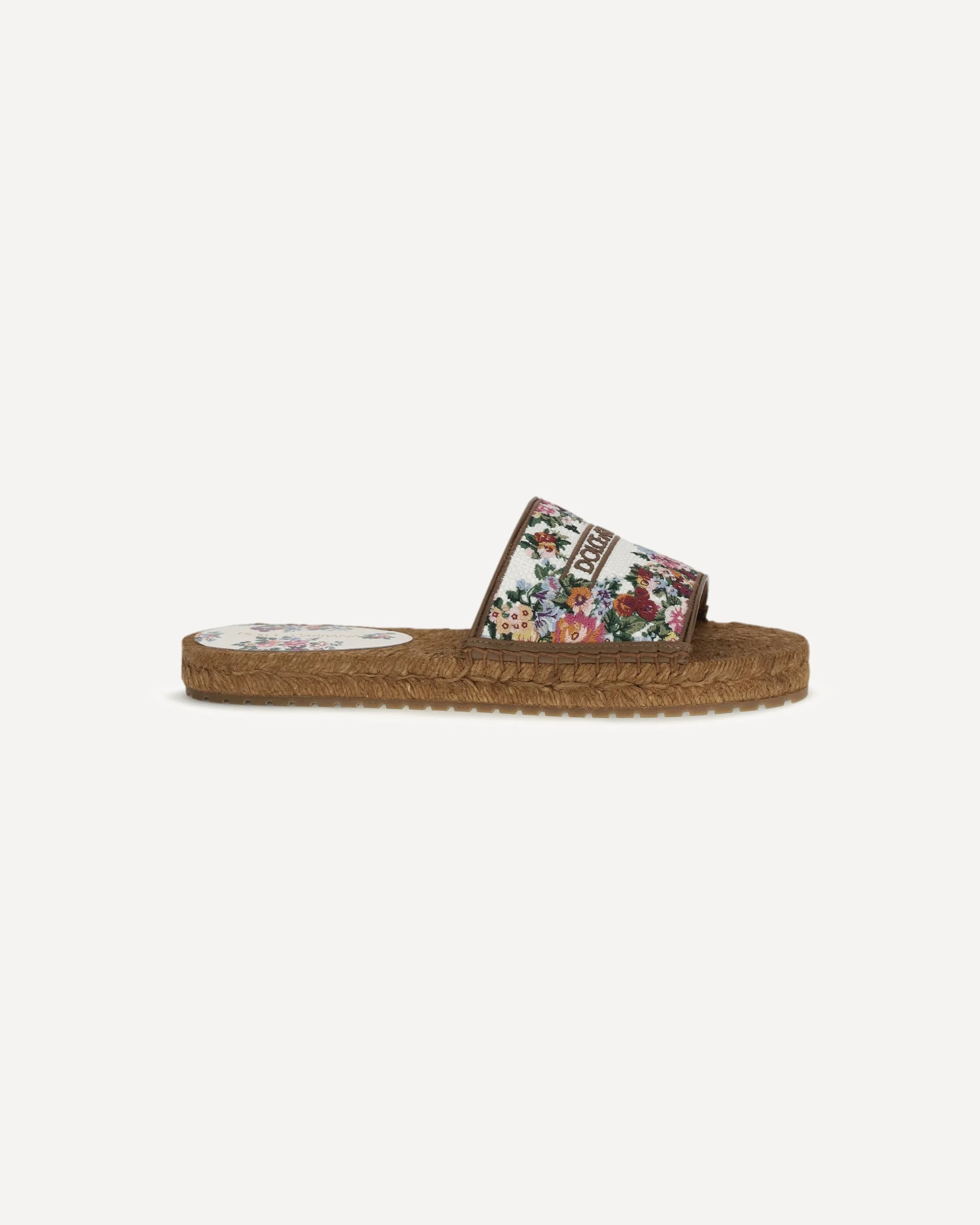 The embroidered espadrille Sandals by Dolce&Gabbana are a perfect combination of style and craftsmanship. The upper is embellished with delicate floral embroidery that adds a touch of freshness and elegance, while the Dolce&Gabbana logo stands out as a symbol of luxury and quality. The flat sole ensures comfort and stability, making these sandals ideal for summer days or casual-chic looks. An accessory that combines tradition and modernity, perfect for those looking for a distinctive and refined touch. DETAILS - Sku: CE0148A6483_8V135 - Season: SS26 - Composition: UPPER 100% Fabric SOLE 100% Raffia - MADE IN ITALY