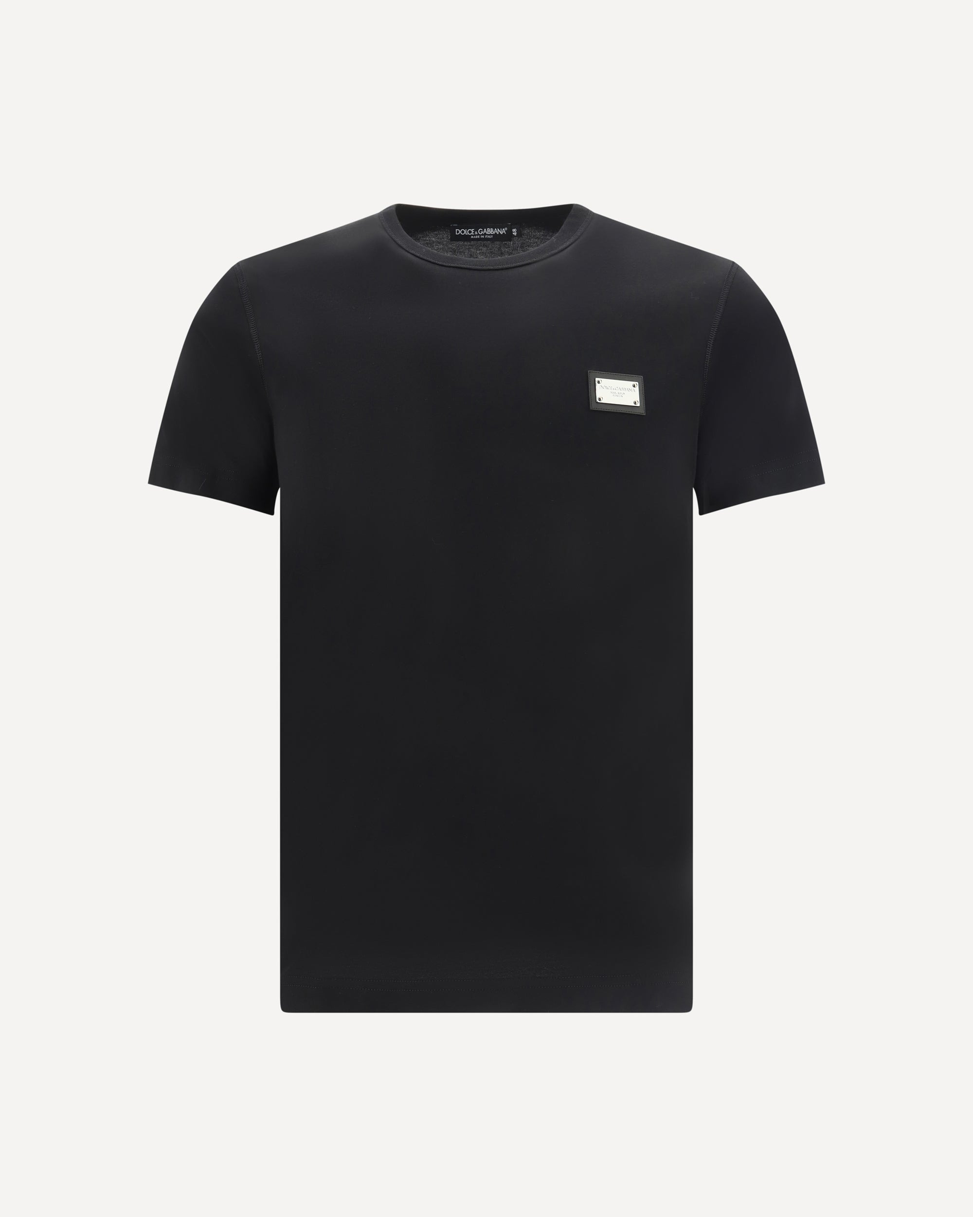 Cotton T-Shirt by Dolce&Gabbana, ribbed crew neck, metal plaque with the brand's iconic D&G monogram engraved and applied on the back, oversize fit. DETAILS sku G8PT1TG7F2I_N0000 color group : BLACK gender : MAN season : AW24 size chart : RTW IT category name : T-SHIRTS