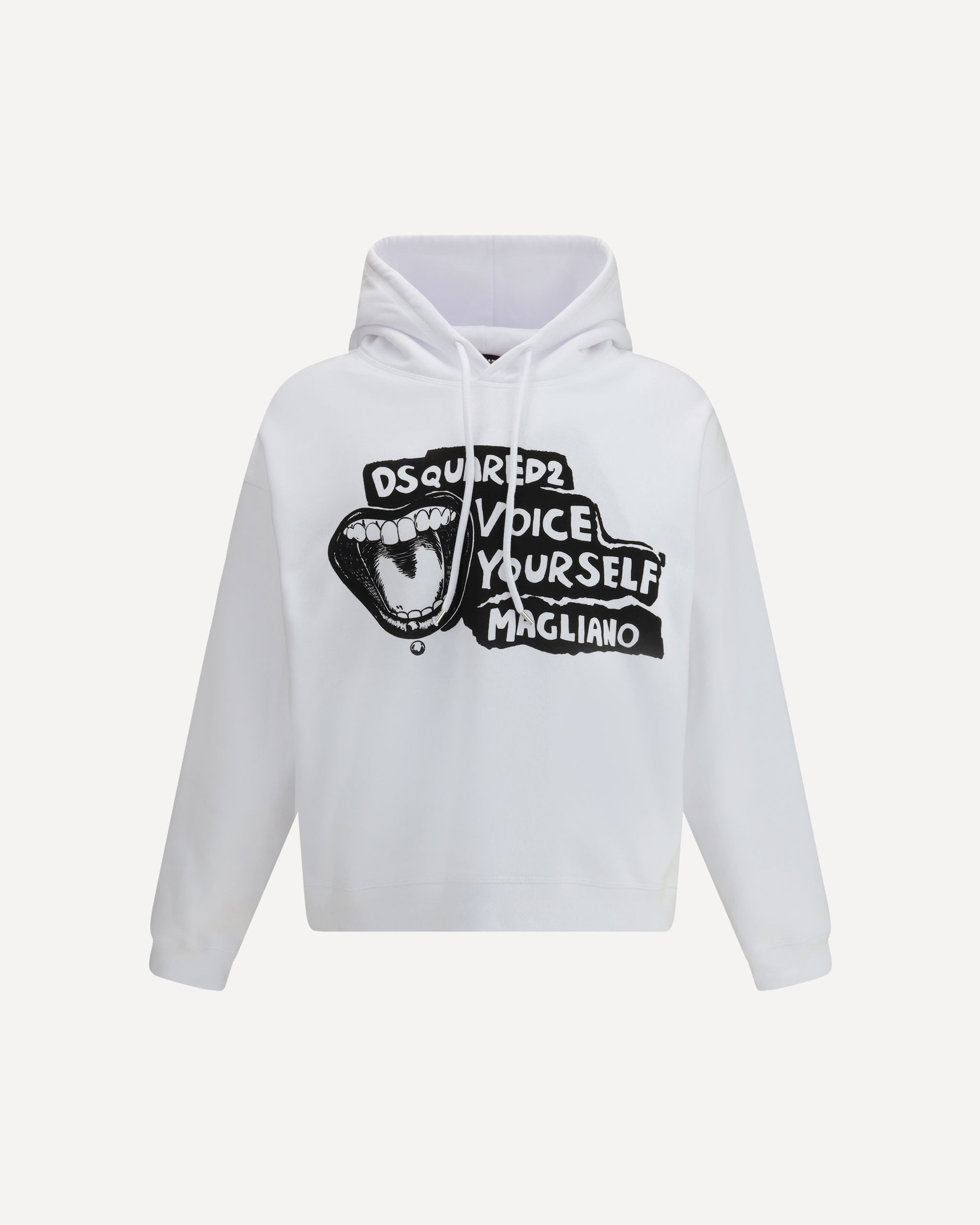 The DsQuared2 Hoodie features a fresh and modern design. The adjustable drawstring hood ensures a customizable fit, while the logo and design printed on the front give the garment a distinctive identity. Perfect for those seeking a blend of comfort and contemporary style. DETAILS - Sku: S71GU0753S25516_100 - Season: AW25 - Fit: Regular - Composition: GENERAL 100% Cotton - MADE IN ITALY