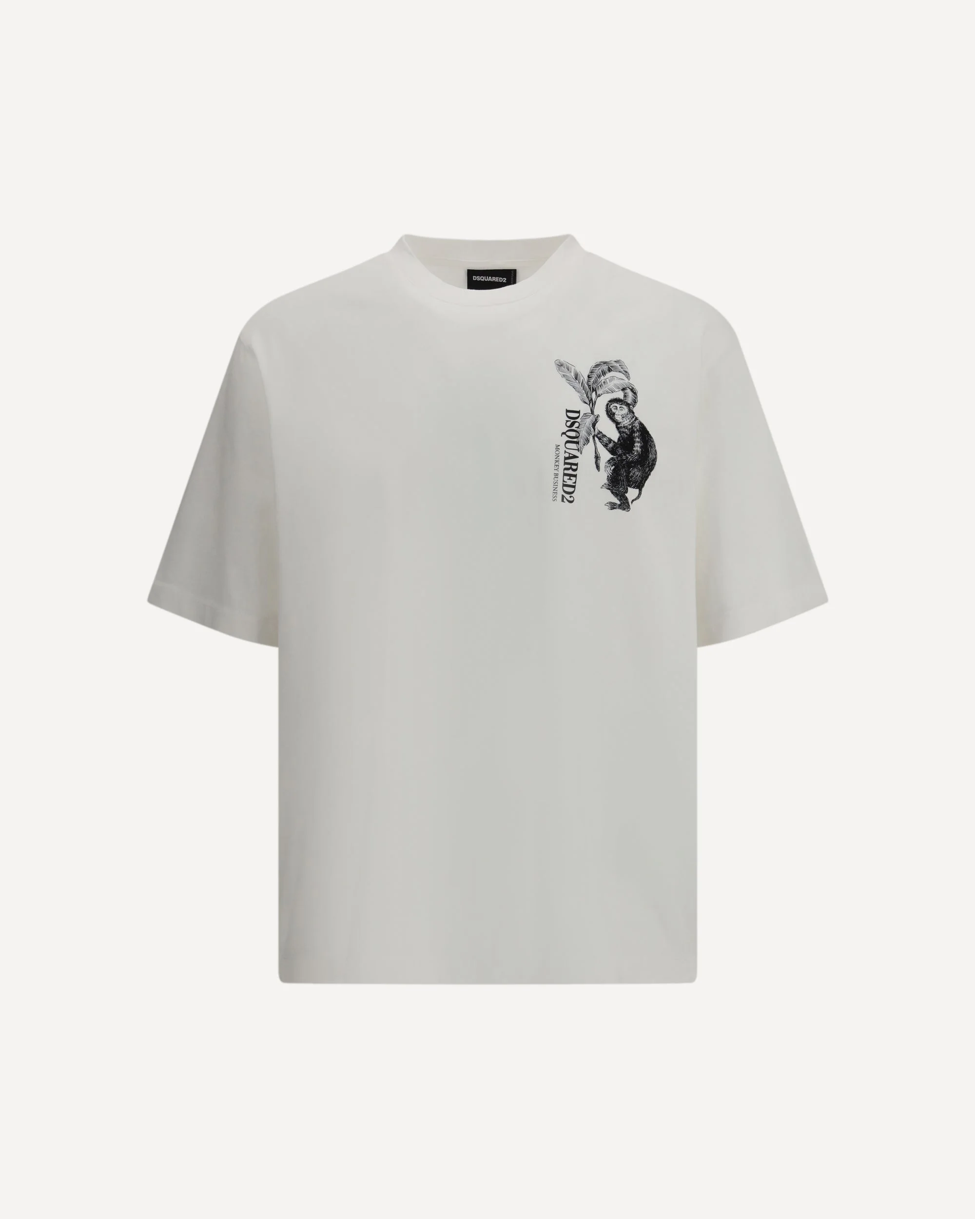 The Monkey business T-shirt by Dsquared2 is crafted from soft cotton jersey and features a loose fit with a relaxed attitude. The clean crewneck frames the graphic print on the front, where a small monkey illustration appears in the upper left area, adding an ironic and distinctive touch to the design. DETAILS - Sku: S74GD1546D20106_100 - Season: SS26 - Fit: Oversize - Composition: GENERAL 100% Cotton - MADE IN PORTUGAL