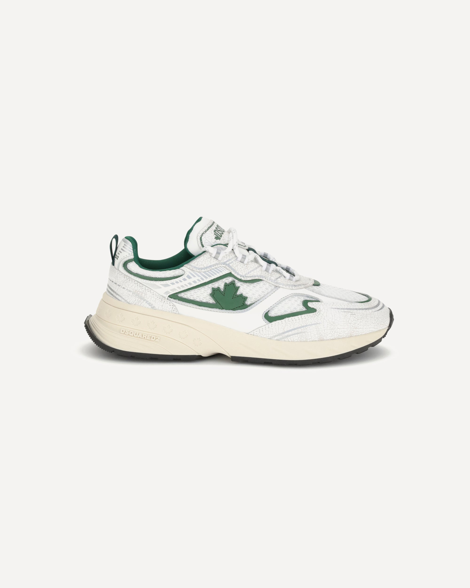 The Sprinter Sneakers by Dsquared2 combine technical materials and a modern design. Crafted from mesh and cracked leather, they are enriched with reflective details for greater visibility. The trekking-style laces emphasize the sporty spirit, while the maple leaf on the side recalls the brand's Canadian identity. The rubber running sole ensures comfort and grip, completed by the Dsquared2 patch on the tongue for a distinctive and recognizable touch. DETAILS - Sku: SNM044443108445_M4142 - Season: AW25 - Composition: UPPER 50% Calf Leather Bos Taurus 50% Polyester SOLE 100% Rubber - MADE IN ITALY