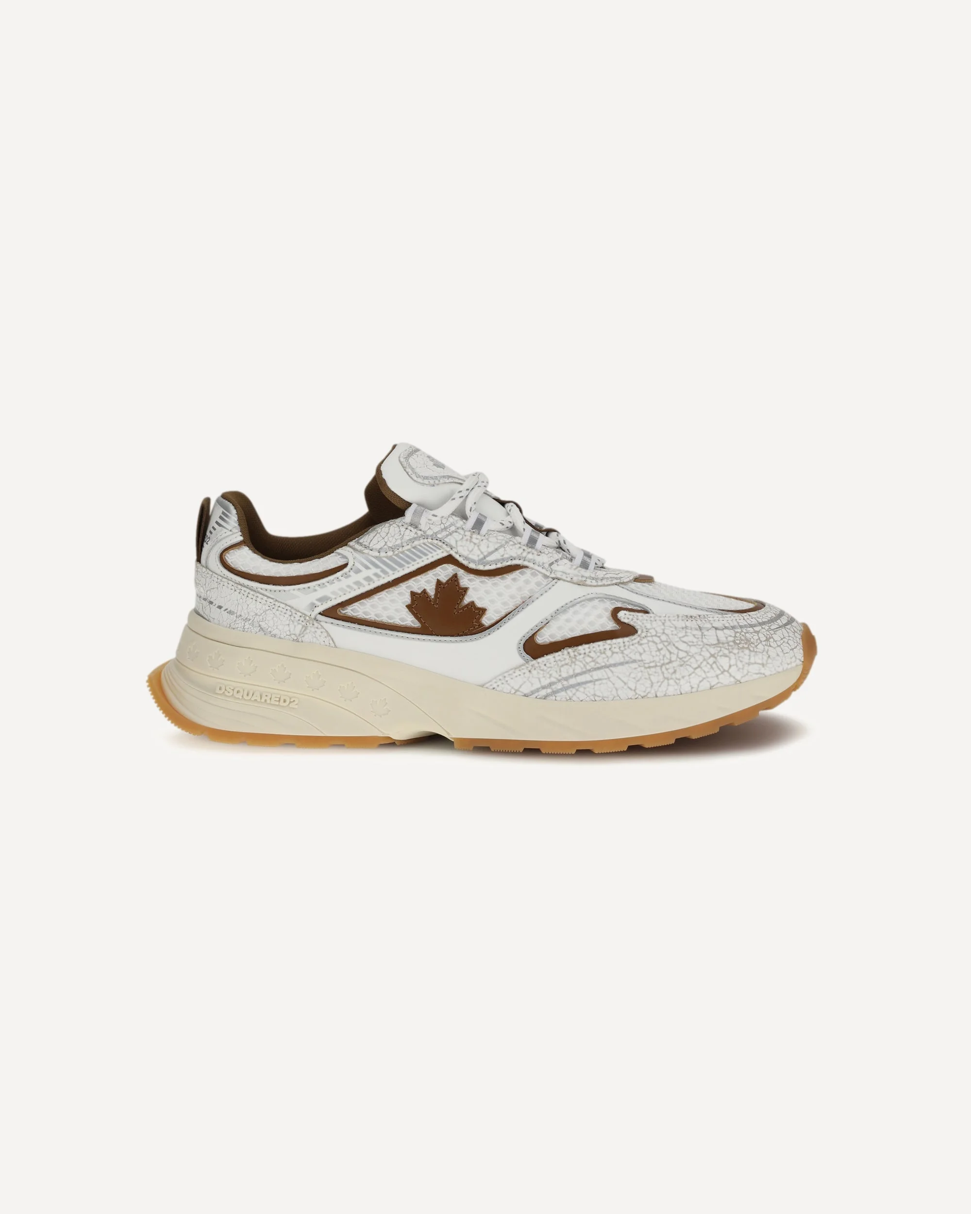 The Sprinter Sneakers by Dsquared2 combine technical materials and a modern design. Crafted from mesh and cracked leather, they are enriched with reflective details for greater visibility. The trekking-style laces emphasize the sporty spirit, while the maple leaf on the side recalls the brand's Canadian identity. The rubber running sole ensures comfort and grip, completed by the Dsquared2 patch on the tongue for a distinctive and recognizable touch. DETAILS - Sku: SNM044443108445_M4221 - Season: SS26 - Composition: UPPER 50% Calf Leather Bos Taurus 50% Polyester SOLE 100% Rubber - MADE IN ITALY