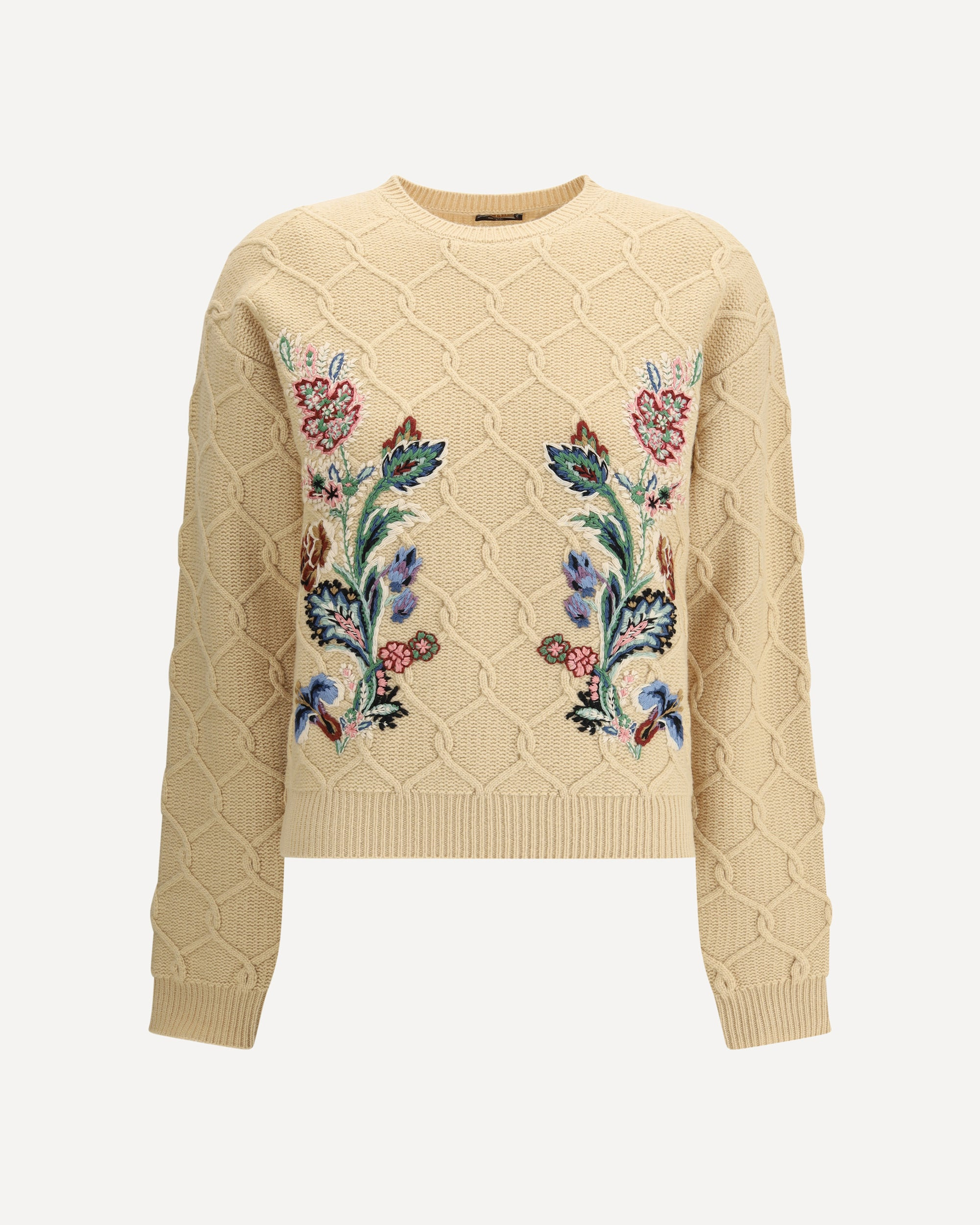 The Etro Sweater combines comfort and sophistication with a distinctive touch. Crafted with a ribbed crew neck, hem and cuffs, it features a classic structure enhanced by floral embroidery sewn onto the front, which gives the garment a delicate and refined elegance, perfectly in line with the poetic aesthetic of the brand. DETAILS - Sku: WRKE0252AV706_M3791 - Season: AW25 - Fit: Regular - Composition: GENERAL 90% Wool 10% Kashmir/capra Hircus - MADE IN ITALY