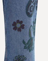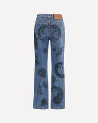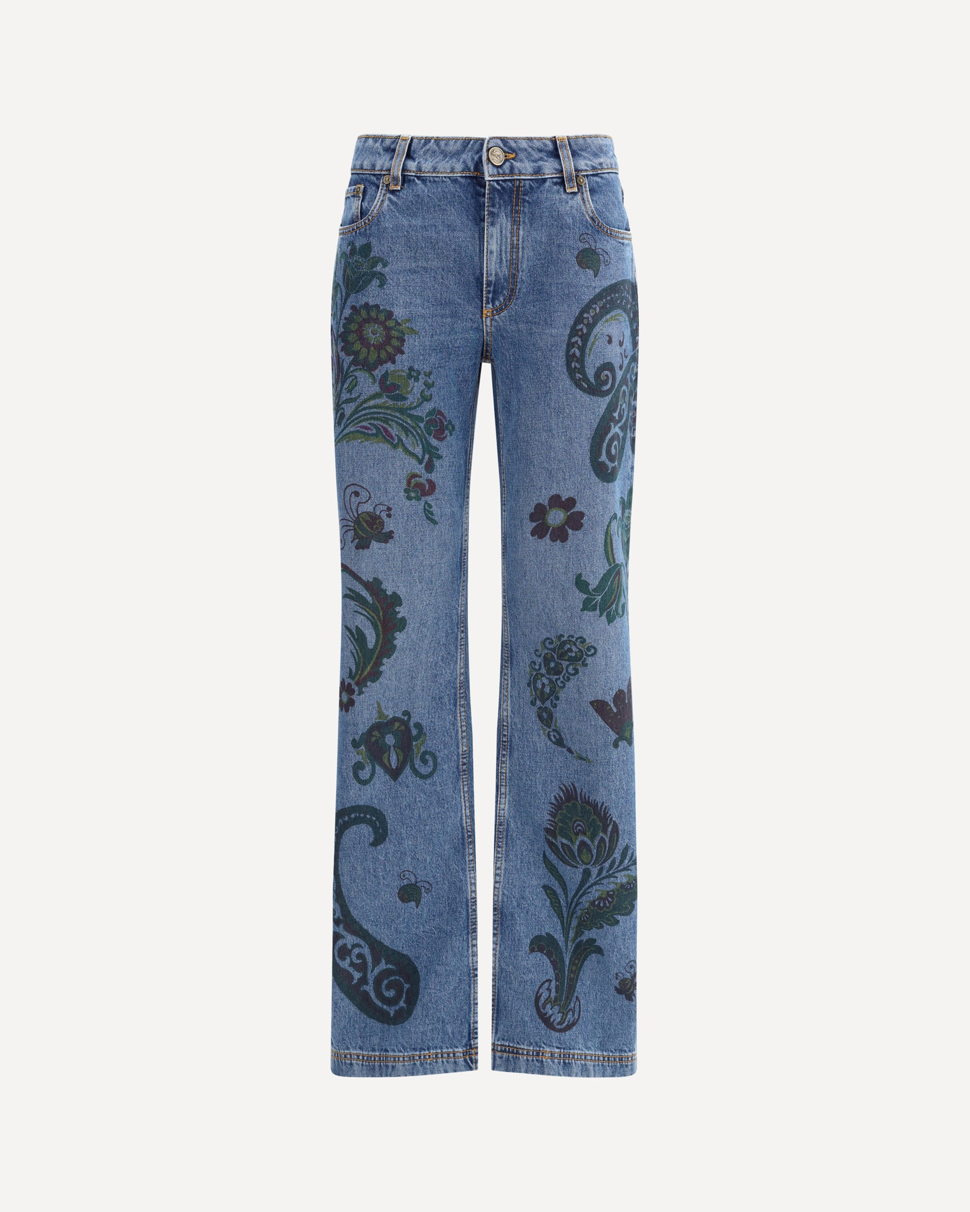 Etro's flower and bee print flare Jeans are a feminine, natural-spirited garment made from cotton denim. They feature a fitted line at the hips that opens into a flared bottom, enhanced by a print inspired by the natural world, with Paisley motifs, flowers and bees. The five-pocket style is complemented by distinctive details such as a metal button with embossed Pegasus logo and a back salpa with ETRO and Pegasus logos. The regular waist, Pegaso button closure and hidden zipper ensure comfort and style, making these jeans an iconic and original garment. DETAILS - Sku: WRNB0029AKC92S9880_S9880 - Season: AW25 - Fit: Regular - Composition: GENERAL 100% Cotton - MADE IN ITALY