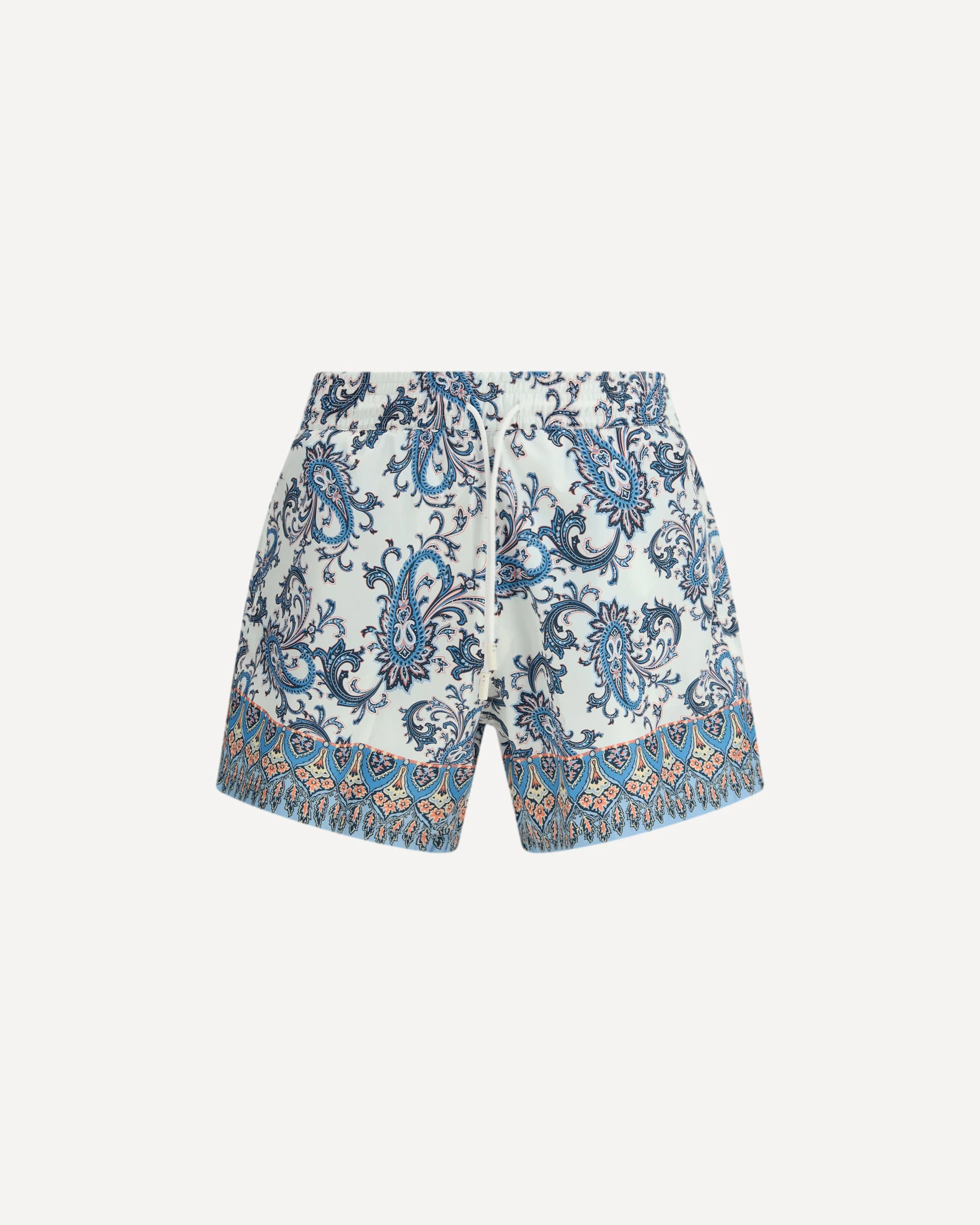 SWIM SHORTS WITH PLACED LEAFY PAISLEY PRINT