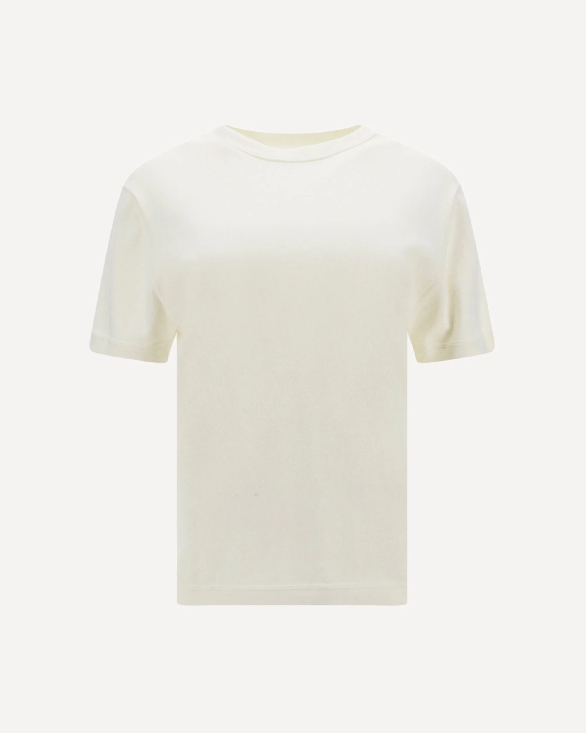 Cotton T-Shirt by Extreme Cashmere, ribbed crew neck, ribbed hem, short sleeve design, monochrome pattern, regular fit. DETAILS sku 26814911FE05_SNOW composition : COTTON 70 color : SNOW gender : WOMAN season : SS23 size chart : WOMAN UNI category name : TOP
