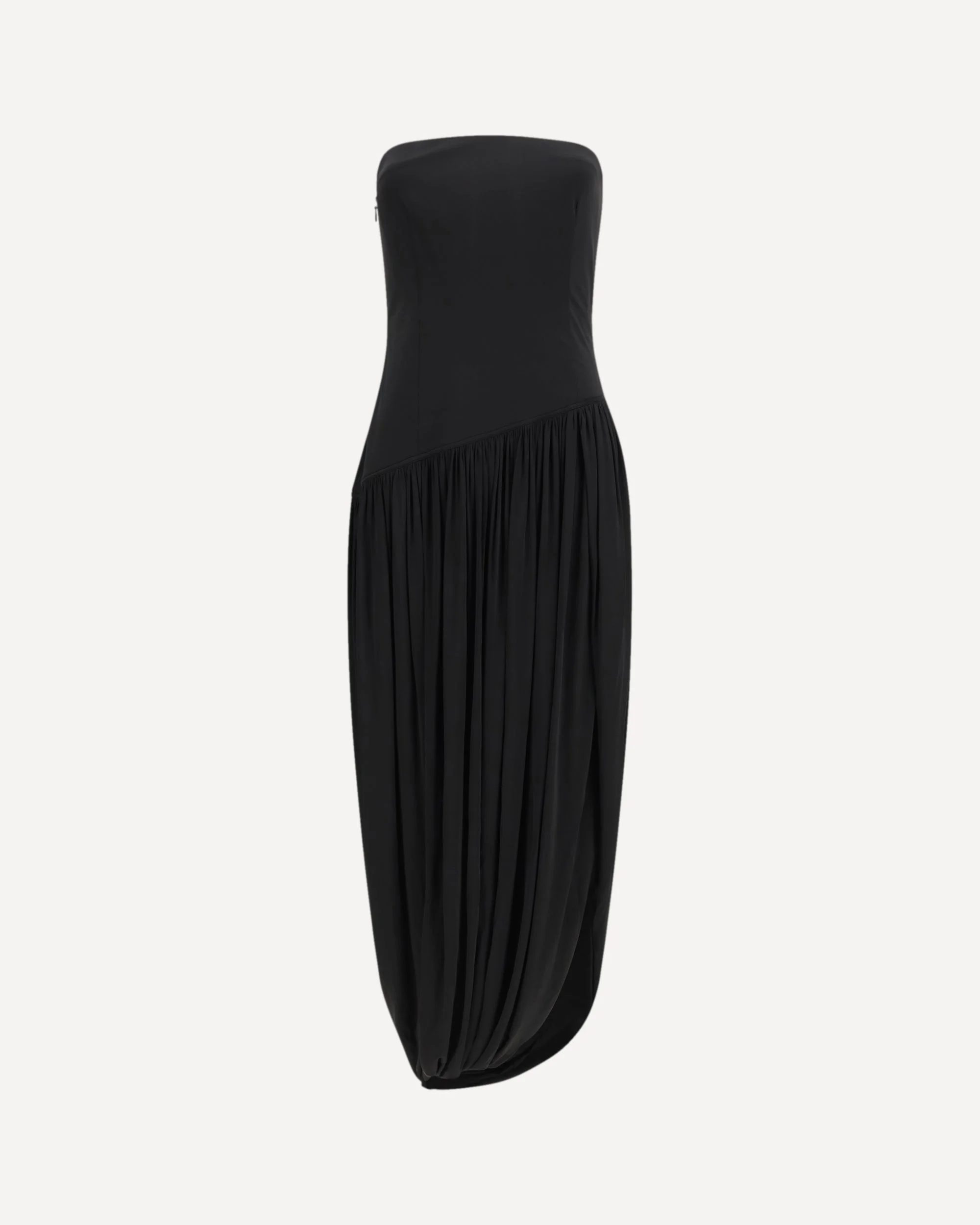 The bustier Dress by Ferragamo is a couture garment with a fitted silhouette, designed to enhance the bust with sensual and refined lines. The diagonal cut at the hips accommodates the draped panel of the skirt, characterized by the special tulip construction, iconic of Maximilian Davis. A perfect balance between elegance and innovative design, this dress expresses uncompromising sophistication, ideal for those looking for a distinctive and striking garment. DETAILS - Sku: 788520_001 - Season: SS26 - Fit: Regular - Composition: GENERAL 93% Viscose 7% Elastane - MADE IN ITALY