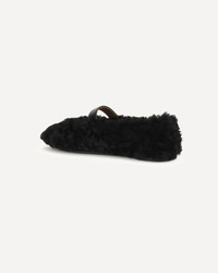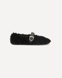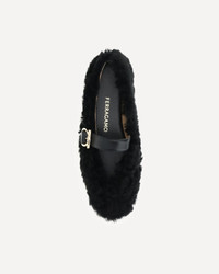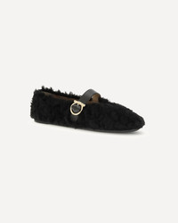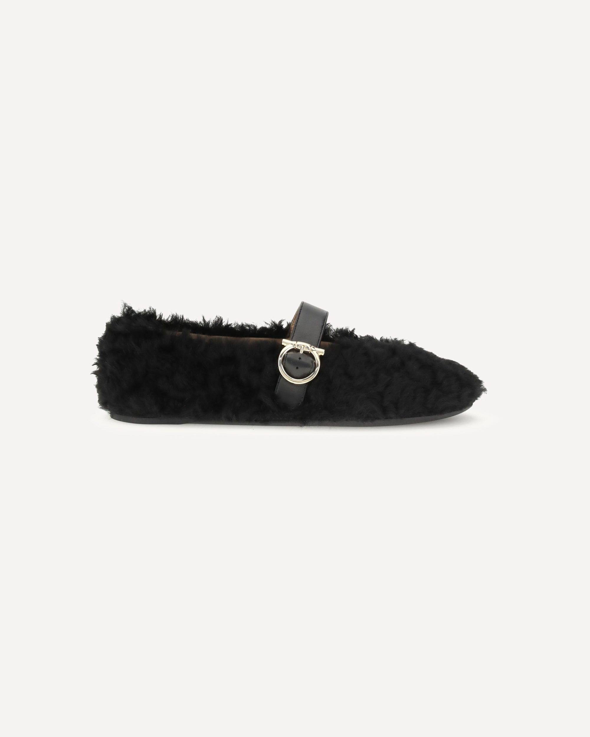 Ferragamo's Gancini-embellished Ballerinas by Ferragamo reinterprets a classic with a playful, contemporary twist. Featuring a contoured neckline and soft silhouette, it is distinguished by a curly shearling lining, ideal for the cold season. The rubber sole maintains the usual flexibility, while the Gancini buckle on the strap adds an iconic and refined detail. DETAILS - Sku: 787502_001 - Season: AW25 - Composition: UPPER 100% Fur SOLE 100% Calf Leather Bos Taurus - MADE IN ITALY
