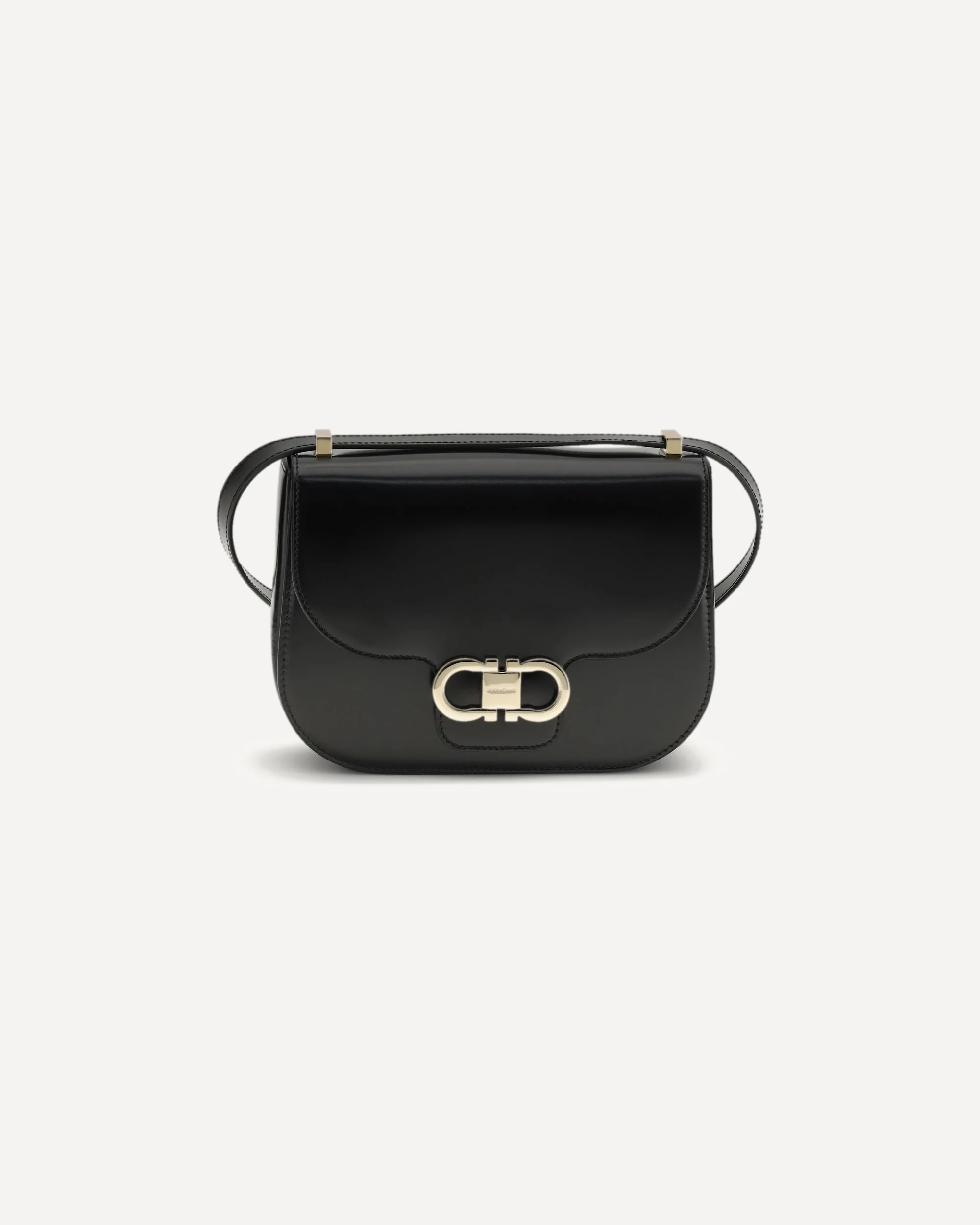 The North-South Double Gancini Shoulder Bag by Ferragamo is a sophisticated interpretation of the brand's tradition. Crafted in calfskin with a glossy finish, it features a shaped front flap decorated with double Gancini in a gold finish, a symbol of timeless elegance. The front pockets with gussets and the back pocket, together with the slots in the central compartment, offer ample space for personal belongings. The adjustable shoulder strap allows it to be worn comfortably across the body or on the shoulder. DETAILS - Sku: 789541_019 - Season: SS26 - Dimension: 21.5x17x7 - Composition: GENERAL 100% Calf Leather Bos Taurus - MADE IN ITALY