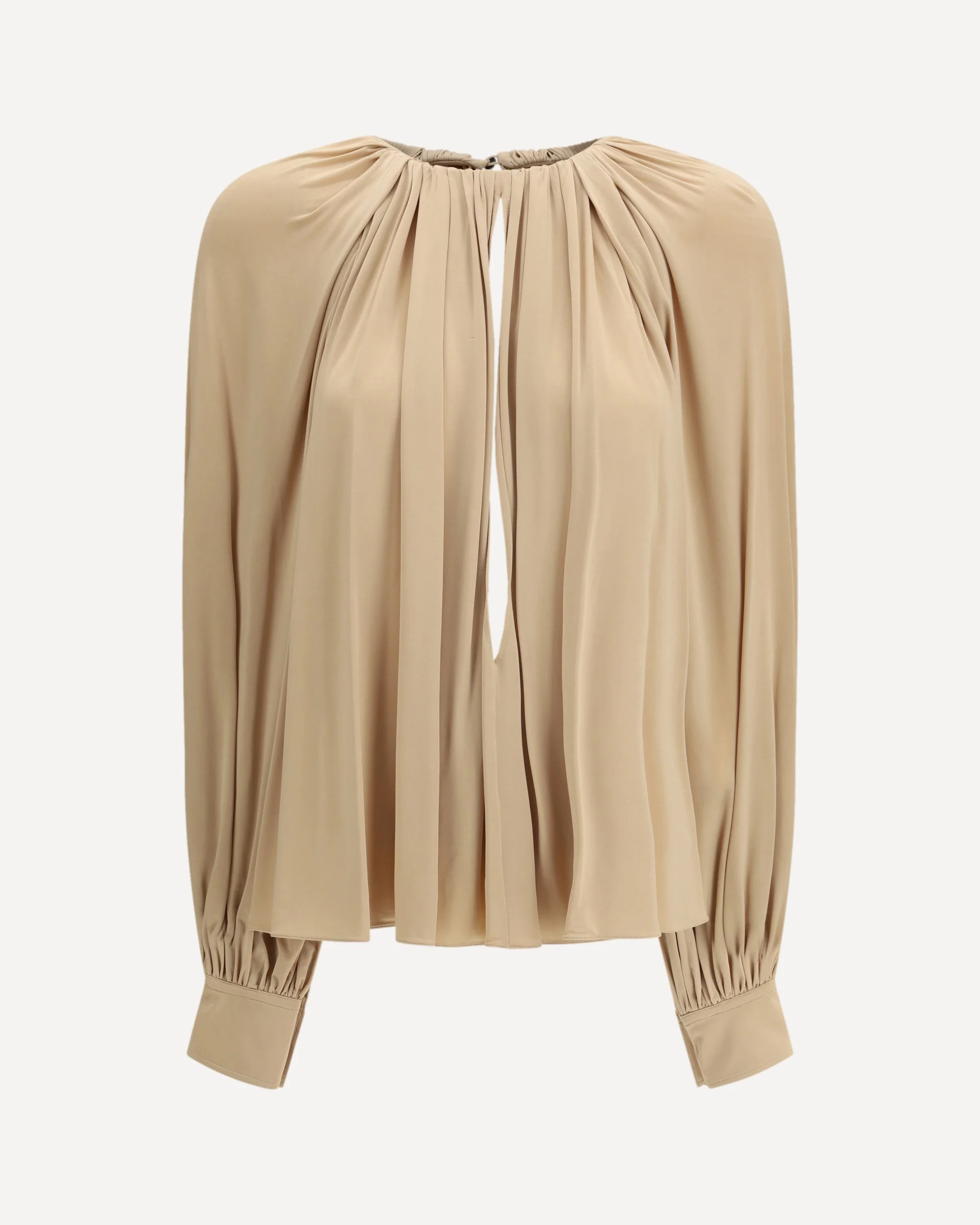 The open-back Blouse by Ferragamo delivers a contemporary and sophisticated aesthetic. Crafted from viscose jersey, it features gathered detailing at the neckline that creates natural folds throughout the design, adding movement and fluidity. The open back reveals the silhouette with a refined balance of sensuality and couture-inspired elegance. DETAILS - Sku: 788185_002 - Season: SS26 - Fit: Regular - Composition: GENERAL 93% Viscose 7% Elastane - MADE IN ITALY