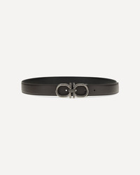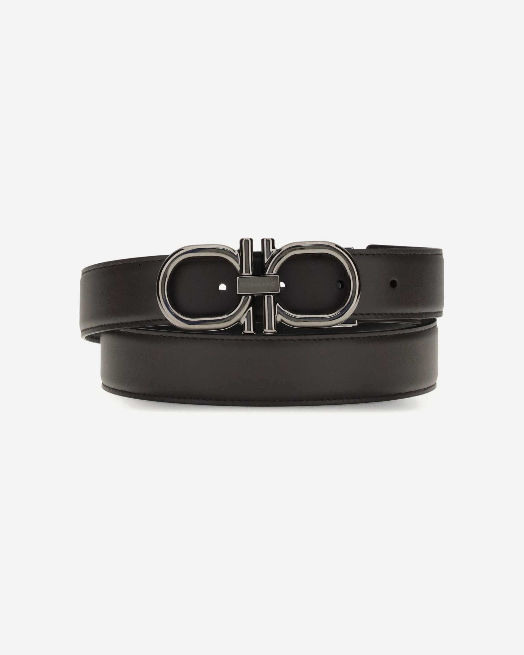 Ferragamo's Gancini Belt is a reversible, adjustable model designed for versatile elegance. The stitched rod lends a casual touch, while the ruthenium-finish buckle, with stylized double Gancini, adds character and sophistication. Complemented by a central engraved signature plaque, it is easily adjusted in length for a tailored fit. DETAILS - Sku: 788532_003 - Season: AW25 - Dimension: 3 - Composition: GENERAL 100% Calf Leather Bos Taurus - MADE IN ITALY
