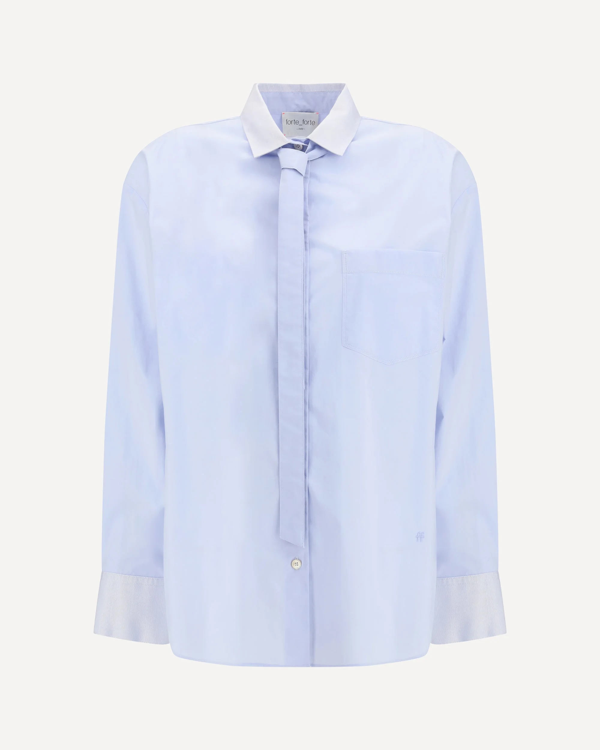 The Oversized Cotton Poplin shirt by Forte Forte conveys a balance of structure and femininity through its essential, modern cut. Tone-on-tone grosgrain details refine the collar and cuffs with precision, while the matching tie element introduces a sartorial gesture of strong impact. The asymmetric hem with rounded side slits invites sophisticated layering, making the piece a versatile and contemporary wardrobe ally. DETAILS - Sku: 14401MYSHIRT_F48M5044 - Season: AW25 - Fit: Oversize - Composition: GENERAL 100% Cotton - MADE IN ITALY